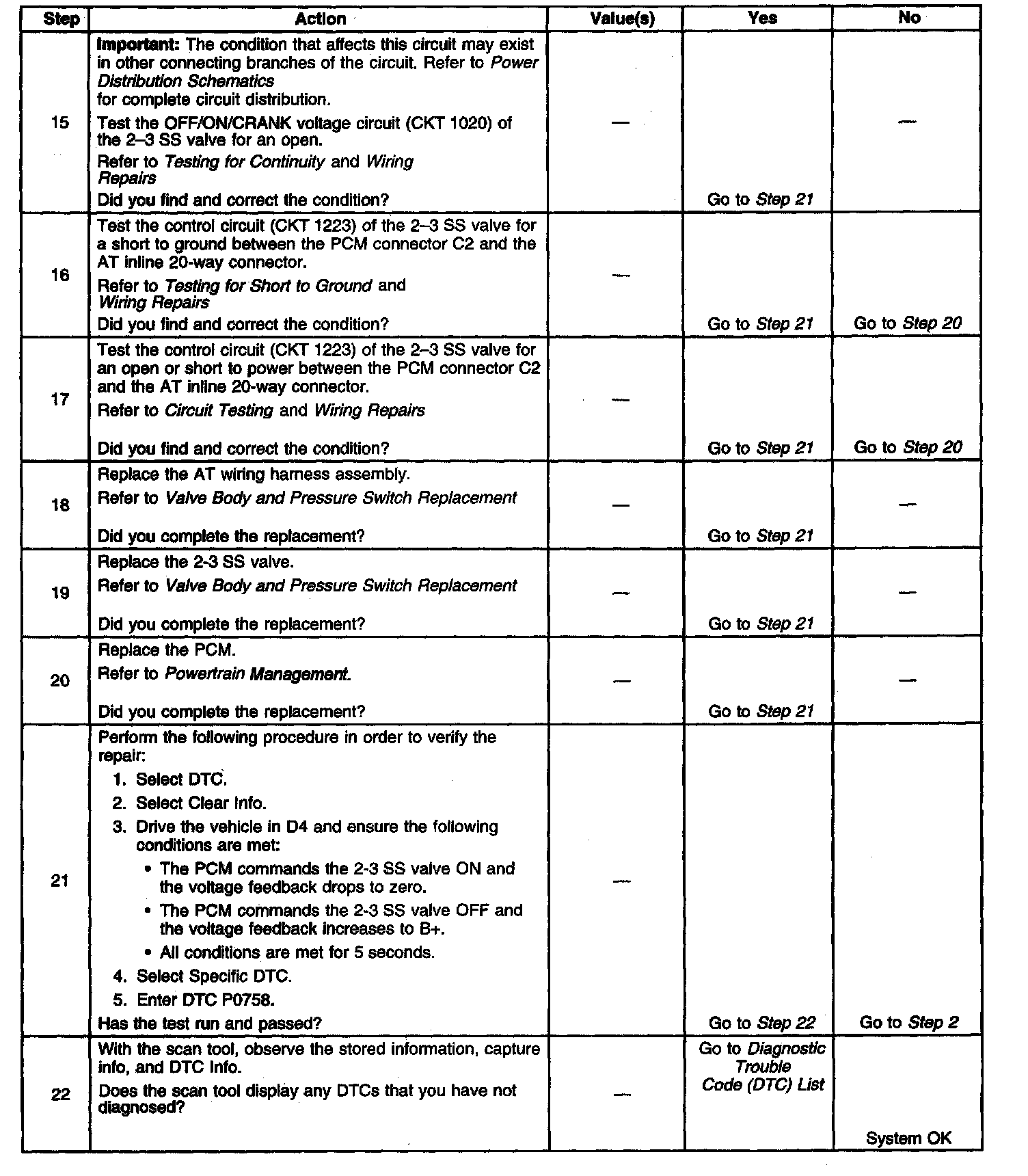 When the PCM detects a continuous open, short to ground or short to power in the 2-3 SS valve circuit, then DTC P0758 sets. DTC P0758is a type A DTC.