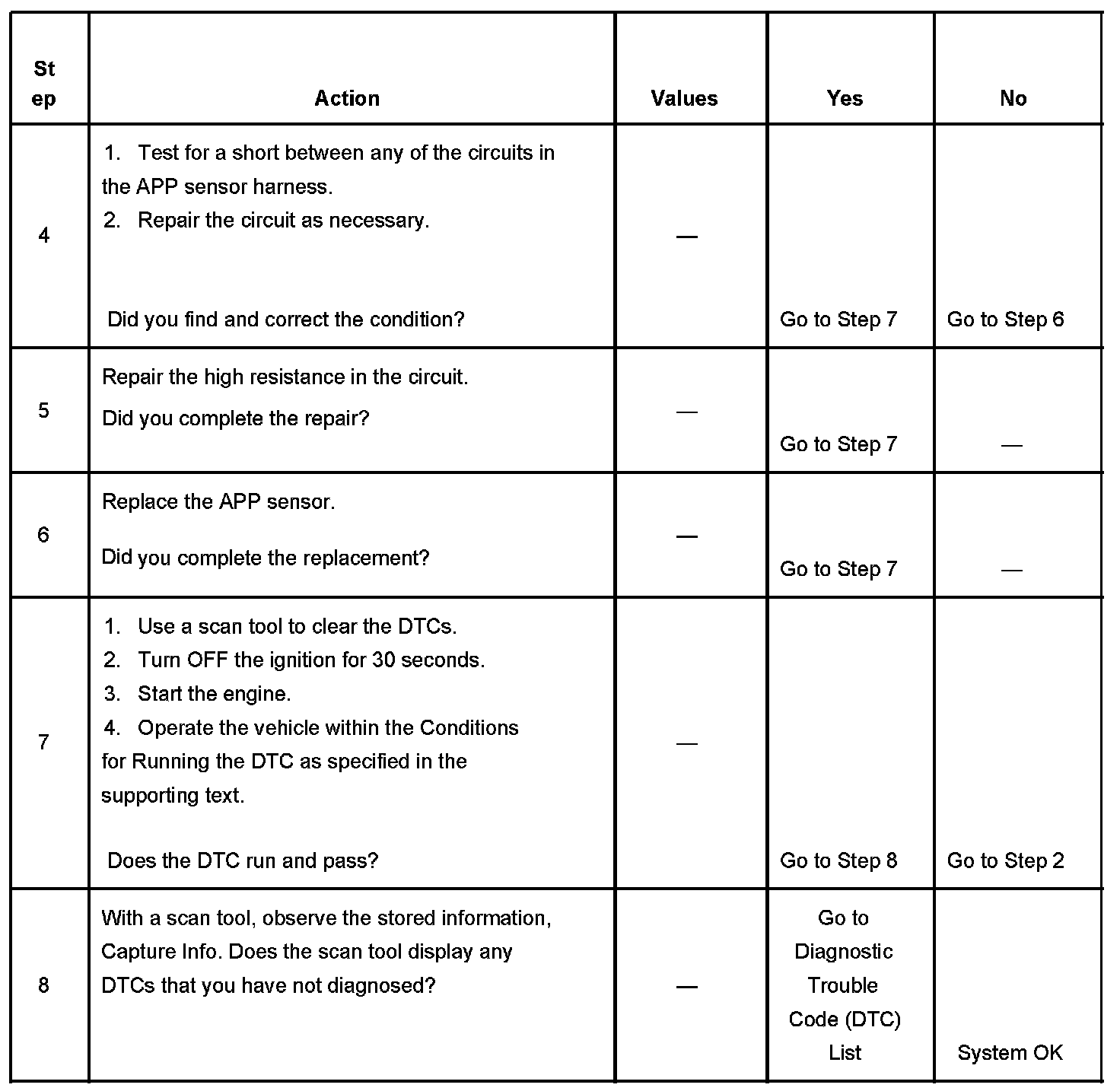 2. Any circuit faults on either APP sensor 1 or 2 will set one of the DTCs listed. Refer to the appropriate table for diagnosis.