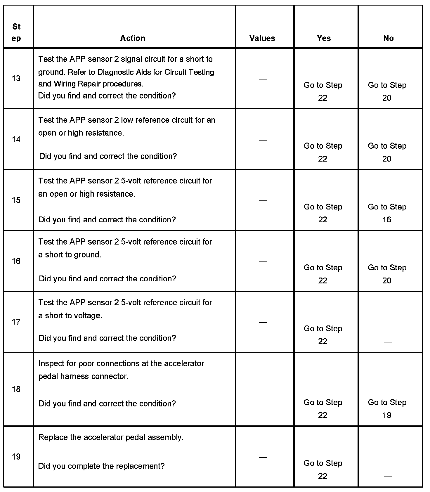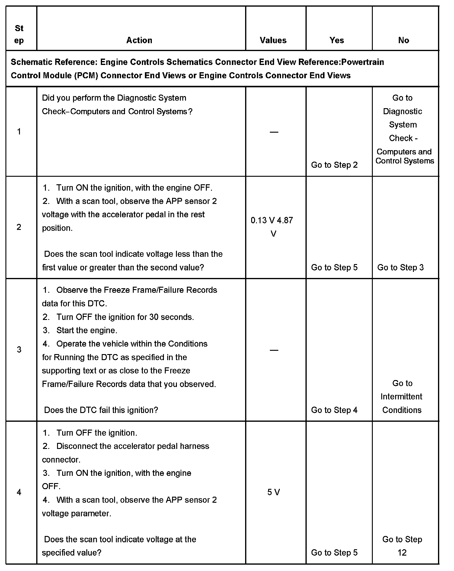 This provides the powertrain control module (PCM) with a signal voltage proportional to accelerator pedal movement. The APP sensor 1 signal voltage at rest position is near the low reference and increases as the pedal is actuated. The APP sensor 2 signal voltage at rest position is near the 5-volt reference and decreases as the pedal is actuated. When APP sensor 2 signal voltage is not within the predicted range, this code sets.