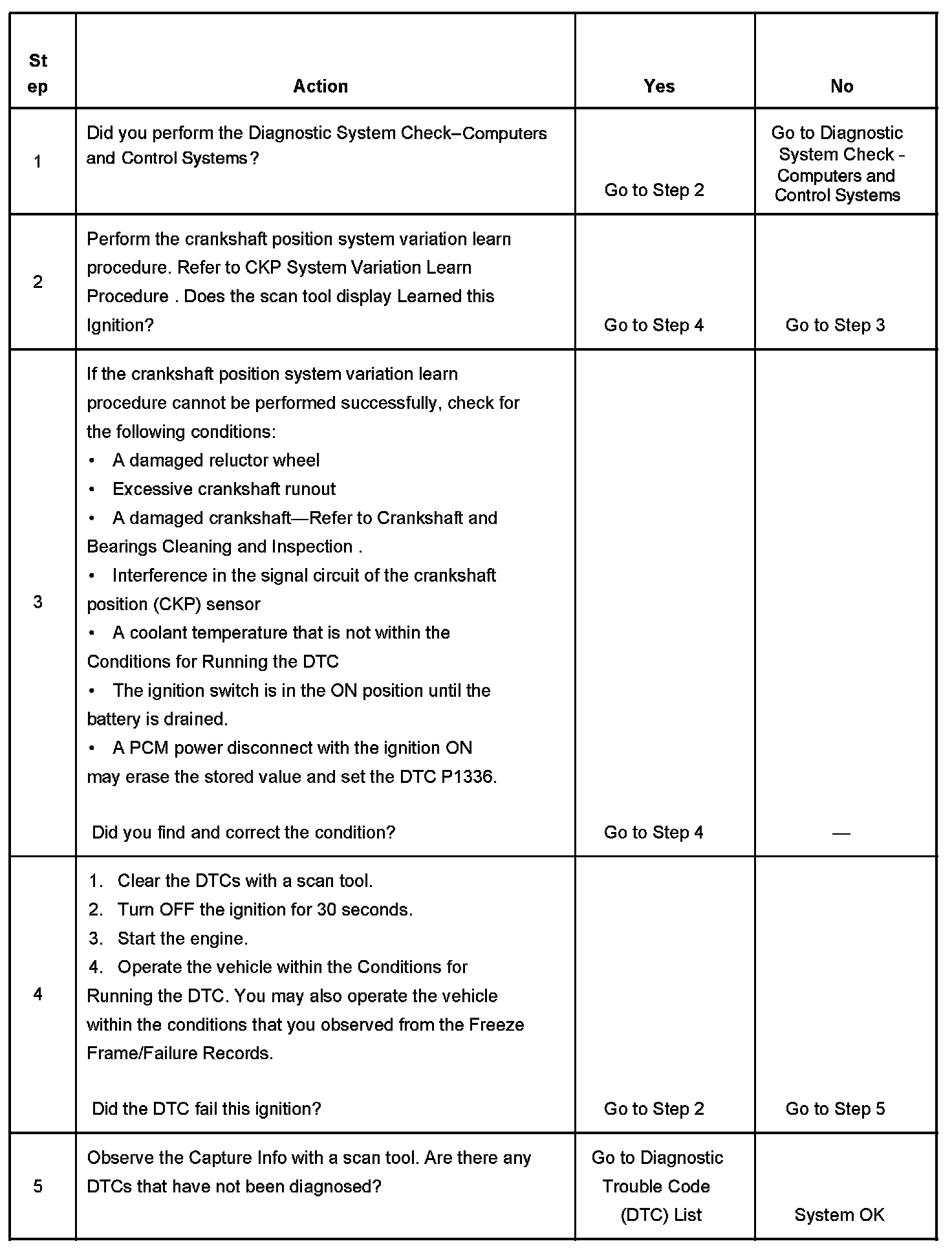 CIRCUIT DESCRIPTIONThe crankshaft position system variation learn feature is used to calculate reference period errors caused by slight tolerance variations in the crankshaft, and the crankshaft position sensors. The calculated error allows the powertrain control module (PCM) to accurately compensate for reference period variations. This enhances the ability of the PCM to detect misfire events over a wider range of engine speed and load. The PCM stores the crankshaft position system variation values after a learn procedure has been performed. If the actual crankshaft position variation is not within the crankshaft position system variation compensating values stored in the PCM, DTC P300 may set. If the PCM detects the CKP system variation values are not stored in the PCM memory, DTC P1336 sets.