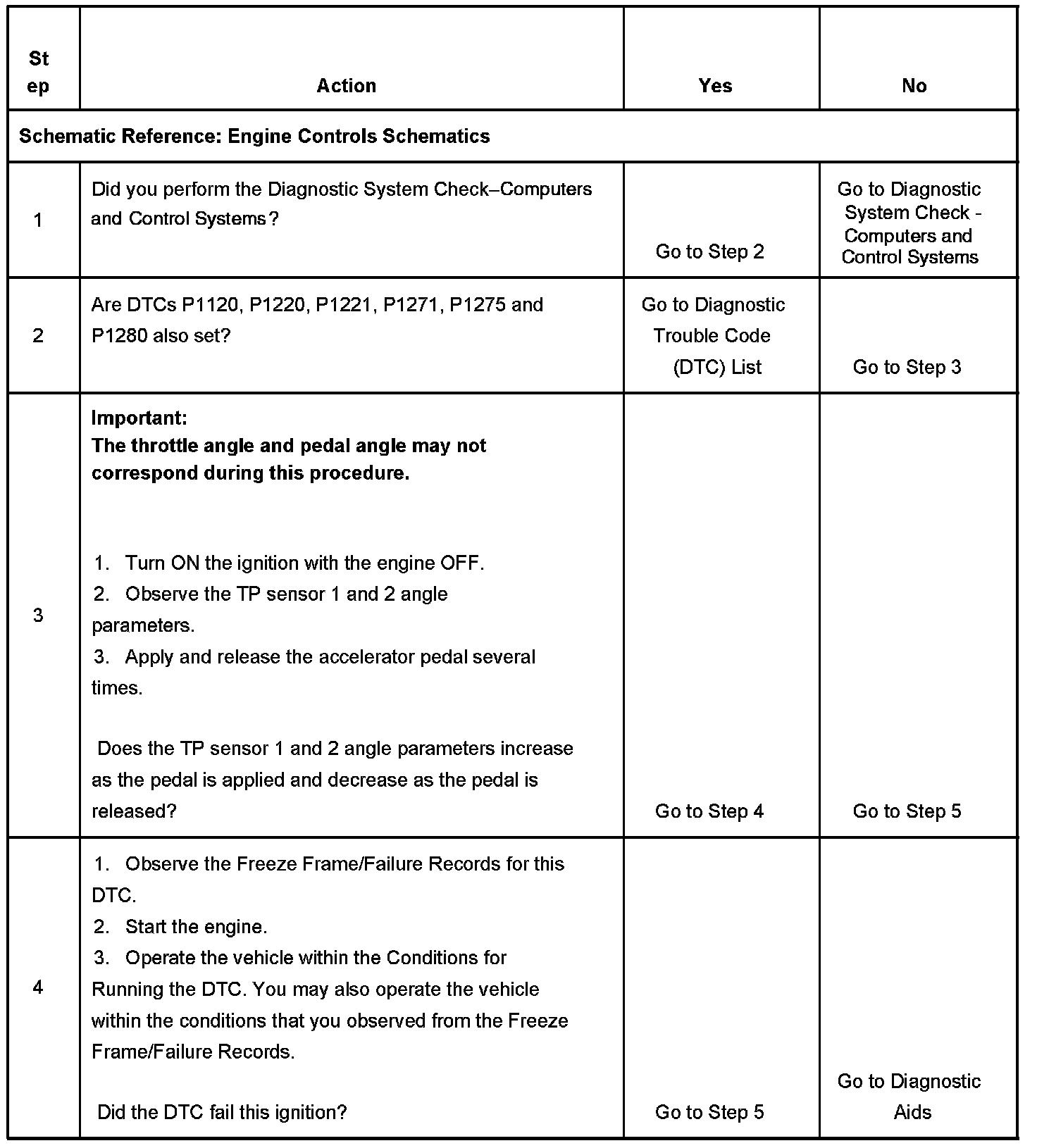 CIRCUIT DESCRIPTIONThe commanded throttle position is compared to the actual throttle position based on accelerator pedal position and possibly other limiting factors. Both values should be within a calibrated range of each other. The powertrain control module (PCM) continuously monitors the commanded and actual throttle positions. This diagnostic trouble code (DTC) sets if the values are greater than the calibrated range.