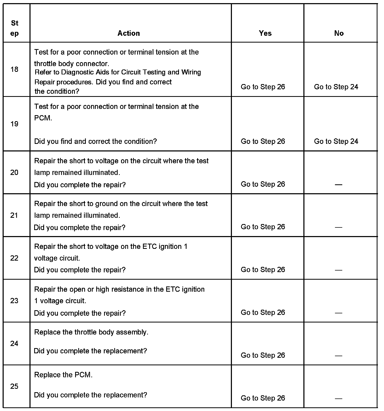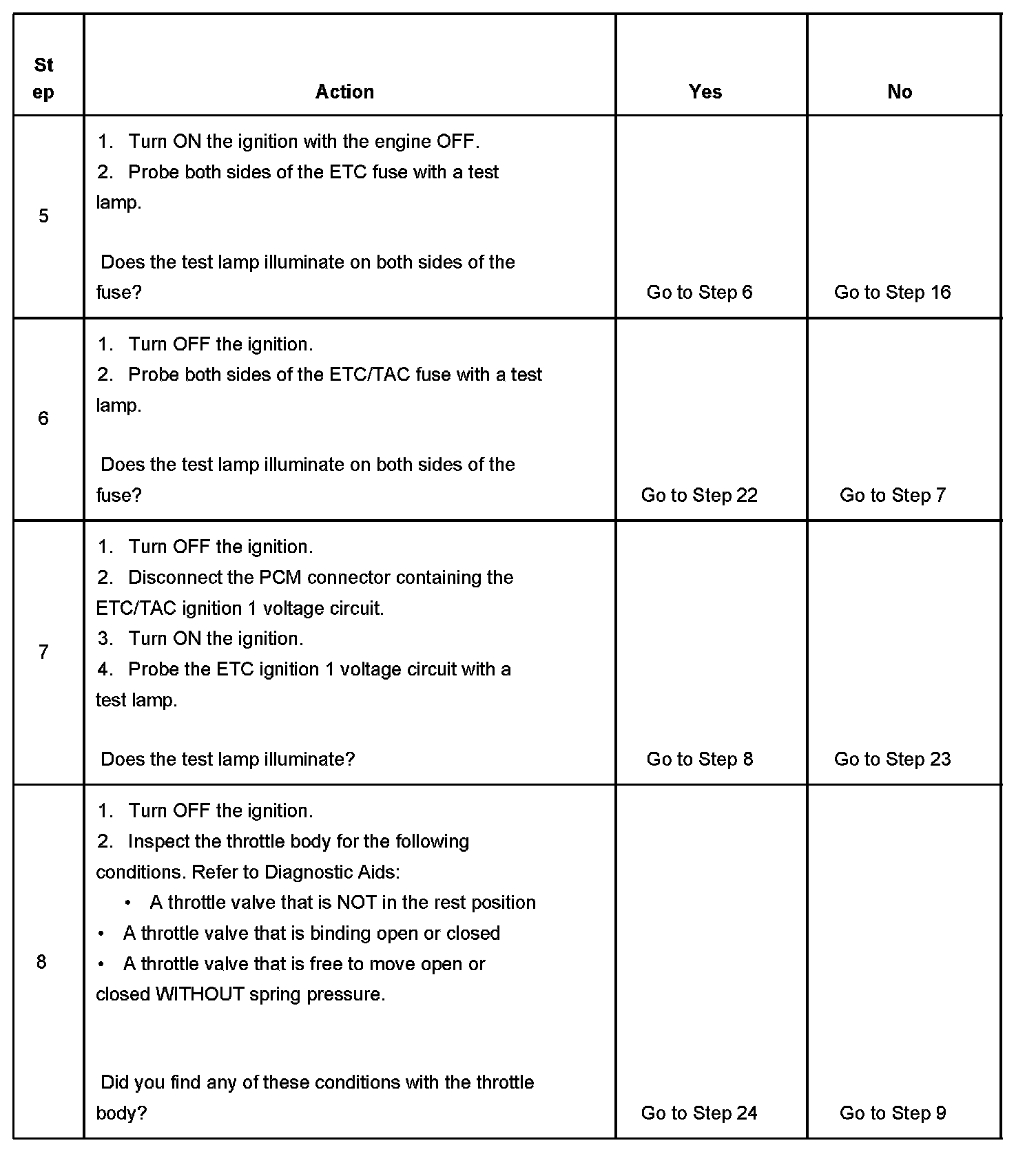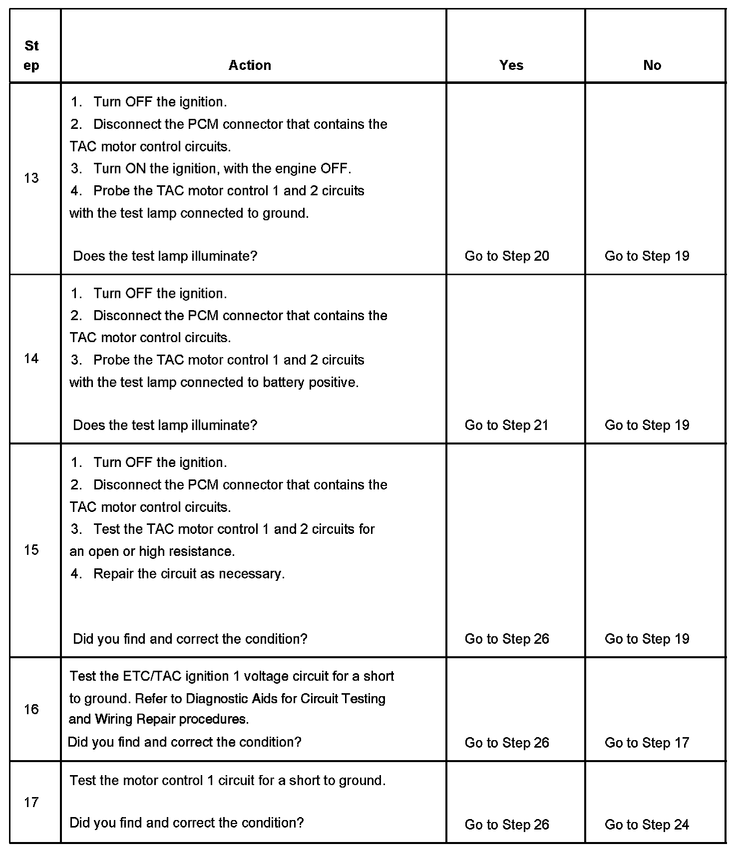 The numbers below refer to the step numbers on the diagnostic table.