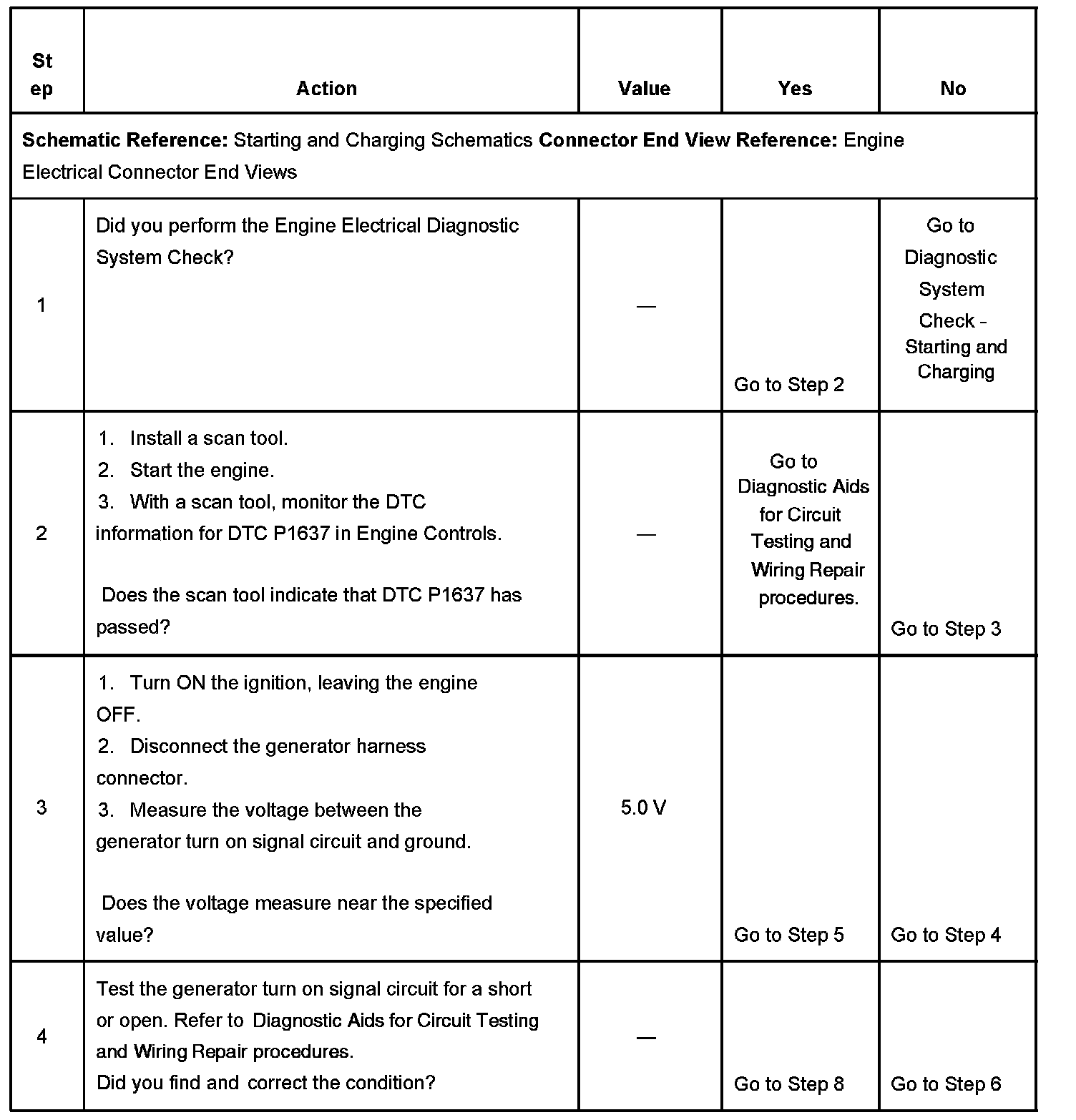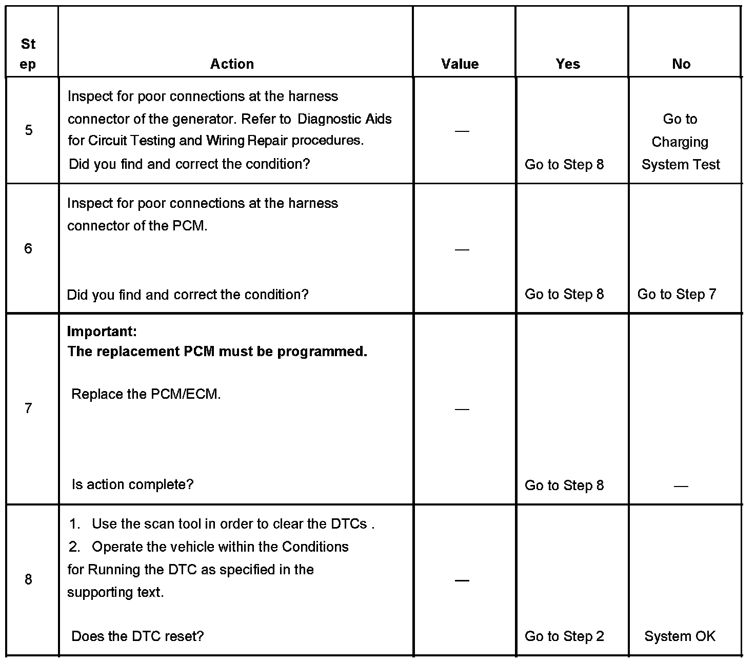 CIRCUIT DESCRIPTIONThe powertrain control module (PCM) uses the generator turn ON signal circuit to control the generator. A high side driver within the PCM allows the PCM to turn the generator ON and OFF. When generator operation is desired, the PCM sends a 5 volt signal to the voltage regulator via the generator turn ON signal circuit. This causes the voltage regulator to begin controlling the generator field circuit. Once the generator is enabled by the PCM, the voltage regulator controls generator output independently of the PCM. Under certain operating conditions, the PCM can turn OFF the generator by turning OFF the 5 volt signal on the generator turn ON signal circuit. The PCM has fault detection circuitry which monitors the state of the generator turn ON signal circuit. If the fault detection circuit senses a voltage other than what is expected, this DTC will set. The voltage regulator also contains fault detection circuitry. If the regulator detects a problem, the regulator will ground the generator turn on signal circuit, pulling the voltage low. This also causes the PCM to set the DTC.