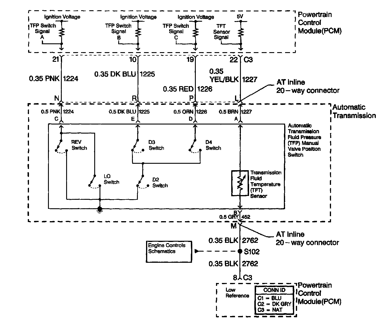 The TFP manual valve position switch cannot distinguish between PARK and NEUTRAL because the monitored valve body pressures are identical. With the engine OFF and the ignition switch in the ON position, the TFP manual valve position switch indicates Park/NEUTRAL. Disconnecting the AT inline 20-way connector removes the ground potential for the three range signals to the PCM. In this case, with the engine OFF, and the ignition switch in the ON position, D2 will be indicated.