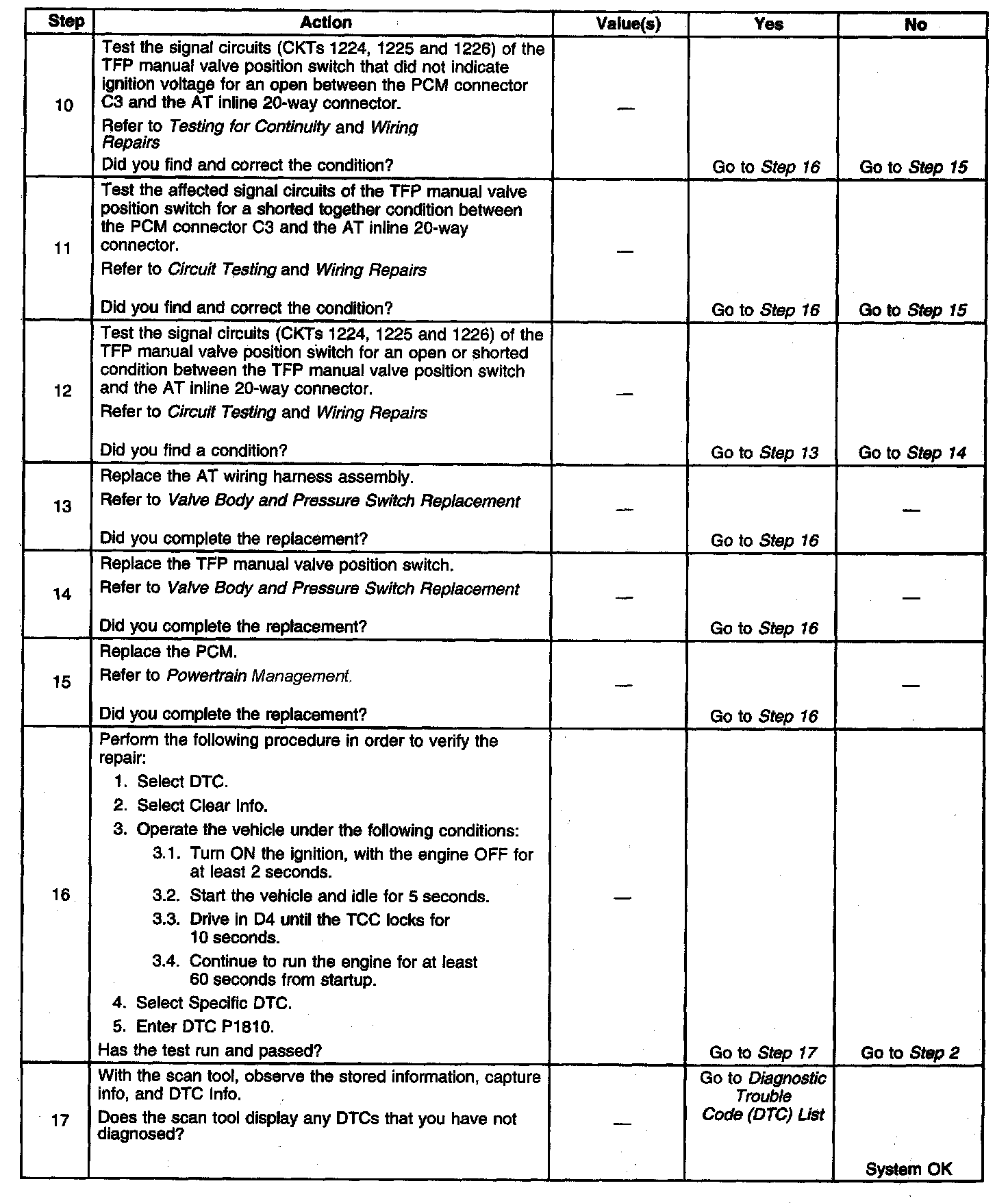 When the PCM detects an invalid state of the TFP manual valve position switch circuit by deciphering the TFP manual valve position switch inputs, then DTC P1810 sets. DTC P1810 is a type B DTC.