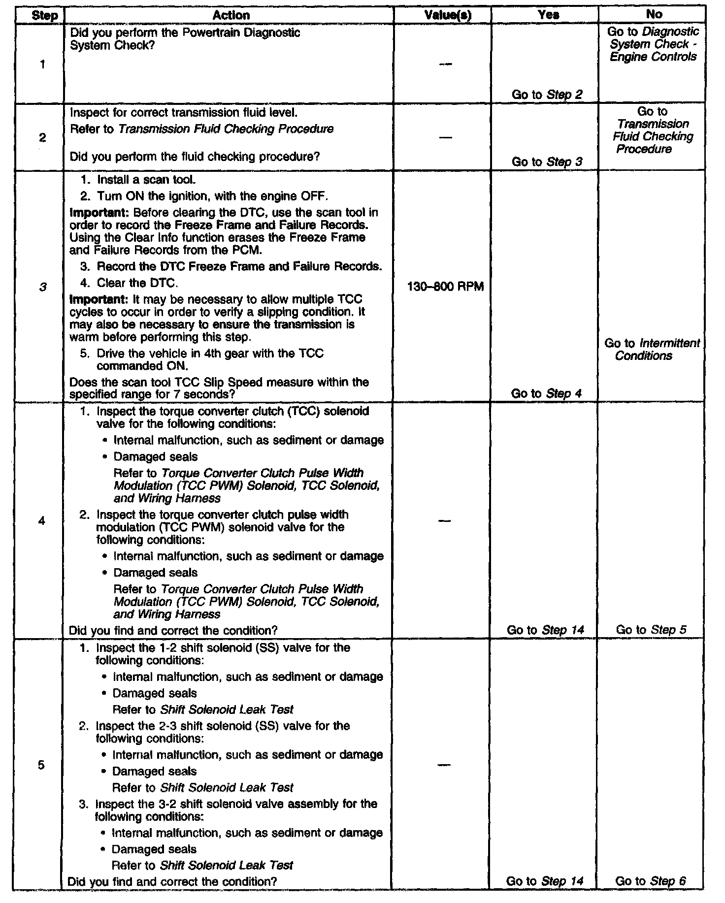 If Condition 1 is met and the TCC slip speed is 130-800 RPM for 7 seconds, then the PCM will command the TCC Off for 1.5 seconds.