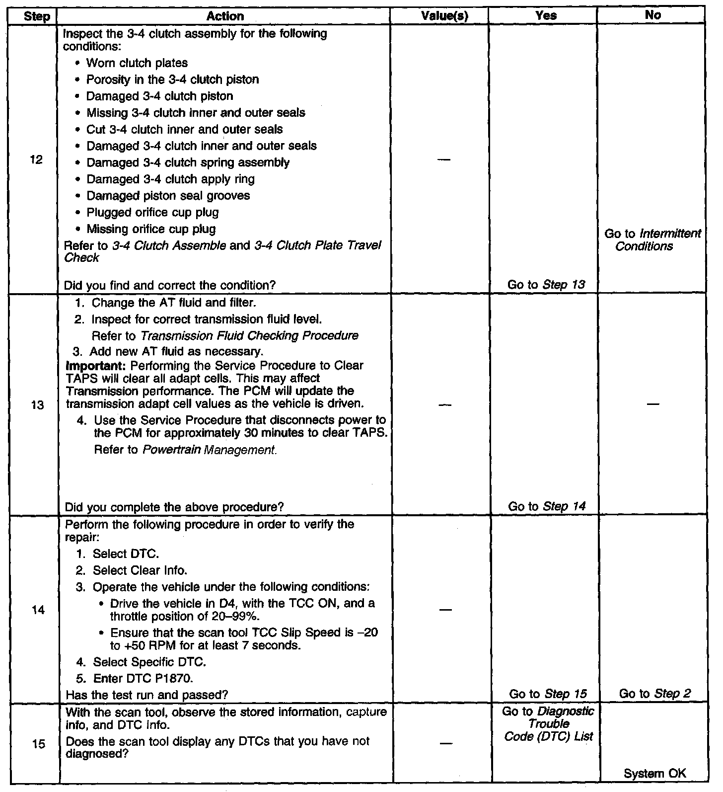 When the PCM detects excessive TCC slip when the TCC should be engaged, then DTC P1870 sets. DTC P1870 is a type B DTC.