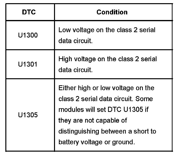 Modules connected to the class 2 serial data circuit monitor for serial data communications during normal vehicle operation. Operating information and commands are exchanged among the modules. In addition to this, Node Alive messages are transmitted by each module on the class 2 serial data circuit about once every 2 seconds. When the module detects one of the following conditions on the class 2 serial data circuit for approximately 3 seconds, the setting of all other class 2 serial communication DTCs is inhibited and a DTC will set.