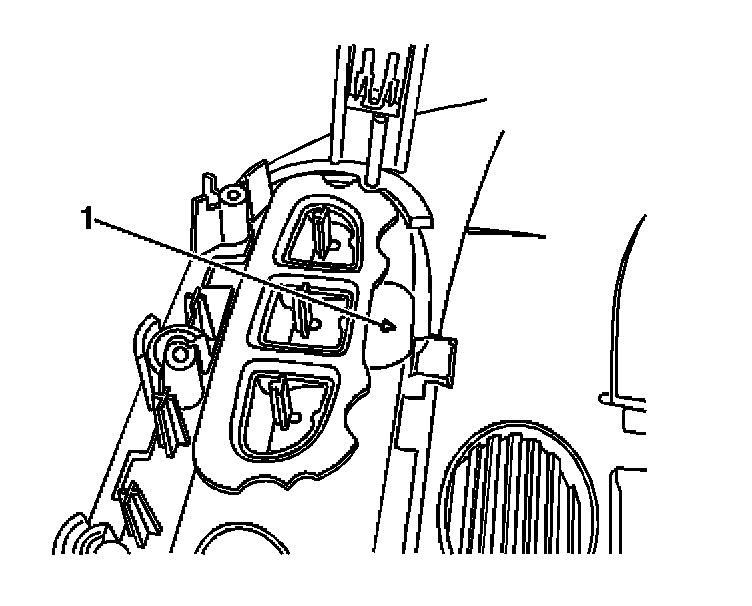 2. Install the garage door opener to the overhead console. Fully recess the light indicator into the opening (1).