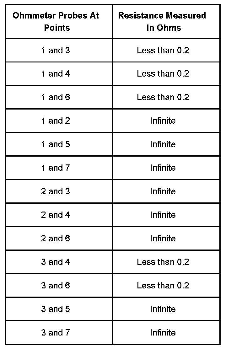 2. Total resistance from end to end of center conductor-ohmmeter probes at points 2 and 5: