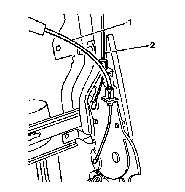 6. Remove the latch release cable (1), and the head rest restraint cable (2) from the left-hand hinge bracket.