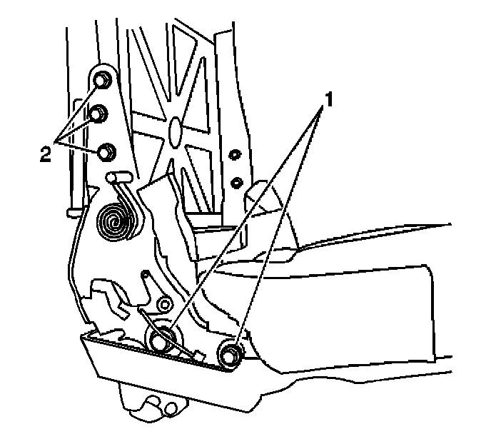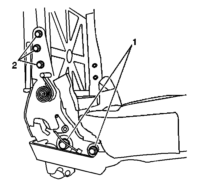 4. Remove the seat back mounting bolts (2) securing the rear seat back frame to the inboard/outboard rear seat back cushion hinge assembly.