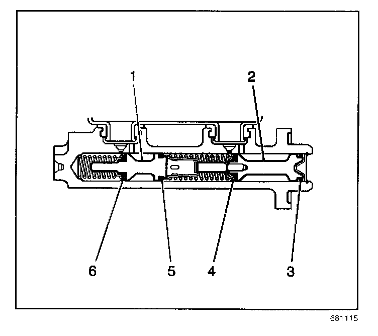 9. Plug the cylinder inlet ports and the rear outlet port. Apply low pressure, non-lubricated filtered air into the front outlet port in order the remove the secondary piston (1) with the primary (6) and secondary (5) seals, and the return spring.