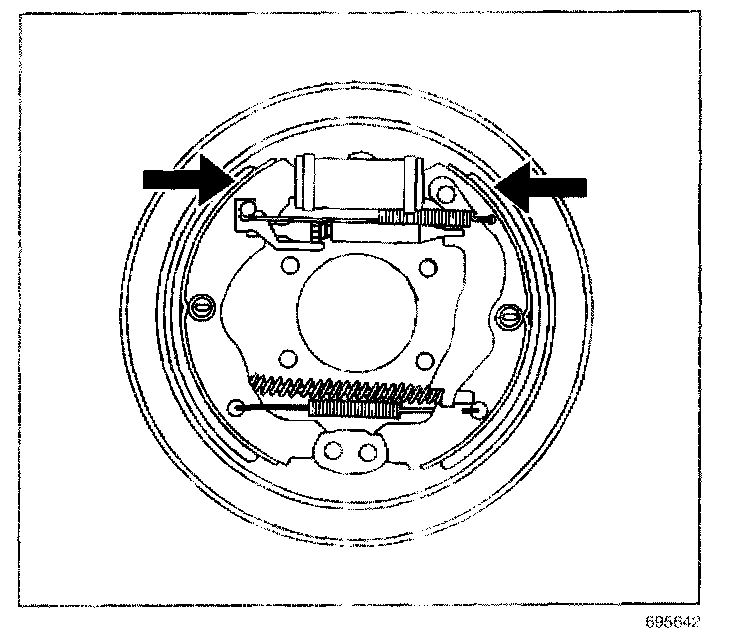 3. Using firm hand pressure simultaneously and evenly apply force on both brake shoes in order to compress the wheel cylinder pistons into their bore.