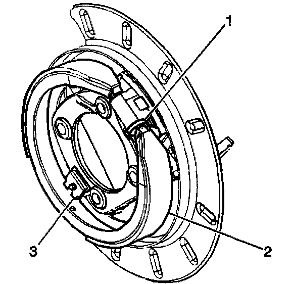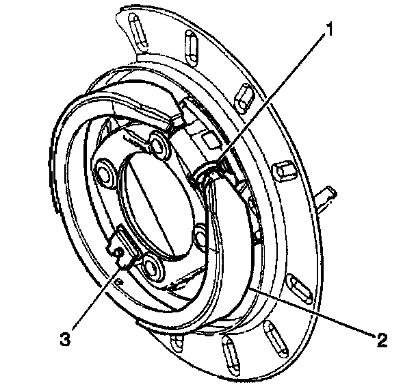 7. Slide the park brake shoe (2) down until it is disengaged from the hold down spring (3).