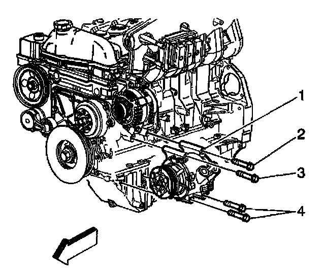 1. Remove the A/C compressor bottom bolts (4) and loosen the top bolts (2, 3).