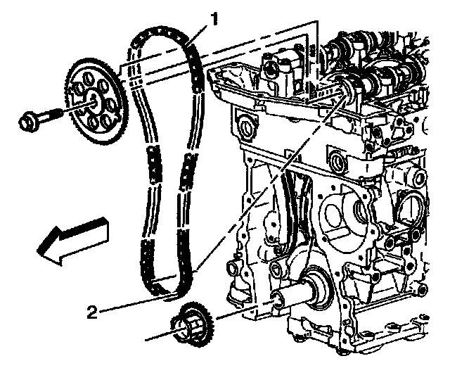 7. Install the timing chain onto the crankshaft sprocket. Align the (dark) link of the timing chain with the timing mark on the crankshaft sprocket (2).