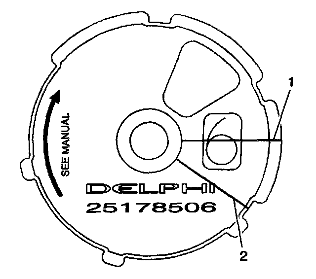 4. Scribe or draw a line (2) on the camshaft position actuator at that position.