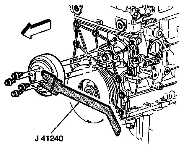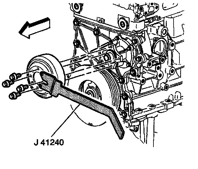 5. Using the J 41240, secure the water pump pulley while tightening the water pump pulley bolts.