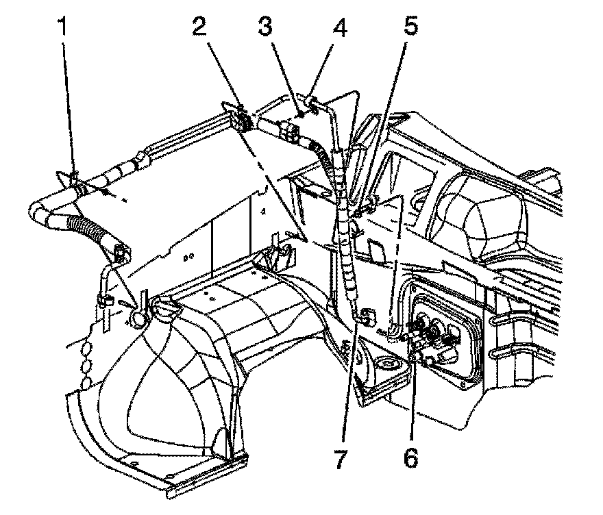 5. Remove the nuts (1, 2) retaining the evaporator tube to the fender.