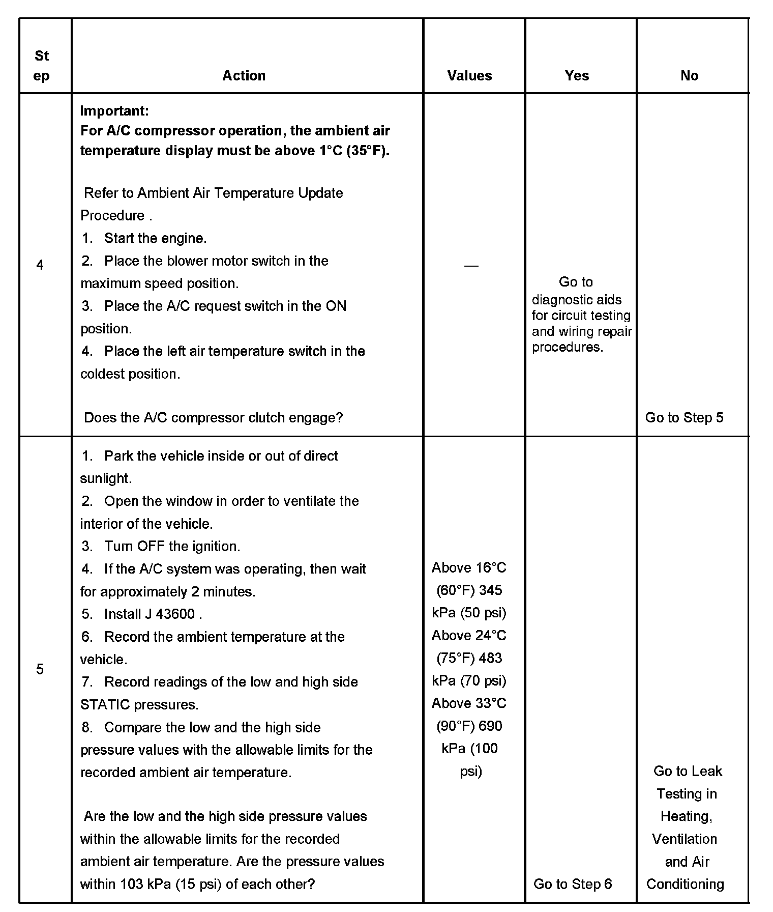 5. This test ensures that there is sufficient refrigerant in the A/C system. The specific values come from the A/C System Performance Test in Heating, Ventilation and Air Conditioning.