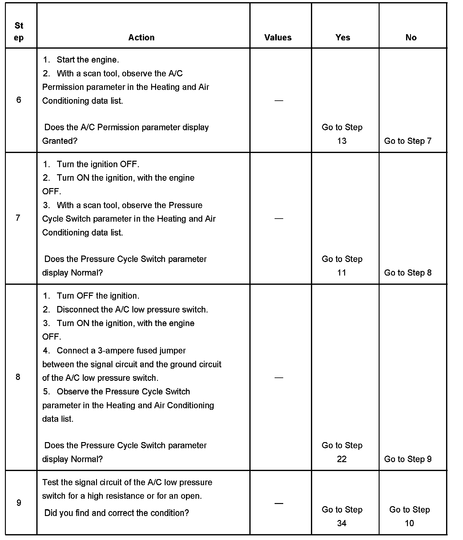 8. This action will simulate a closed switch condition. If the Pressure Cycle Switch parameter reads Low Pressure than there is a circuit condition or a condition with the HVAC control module.