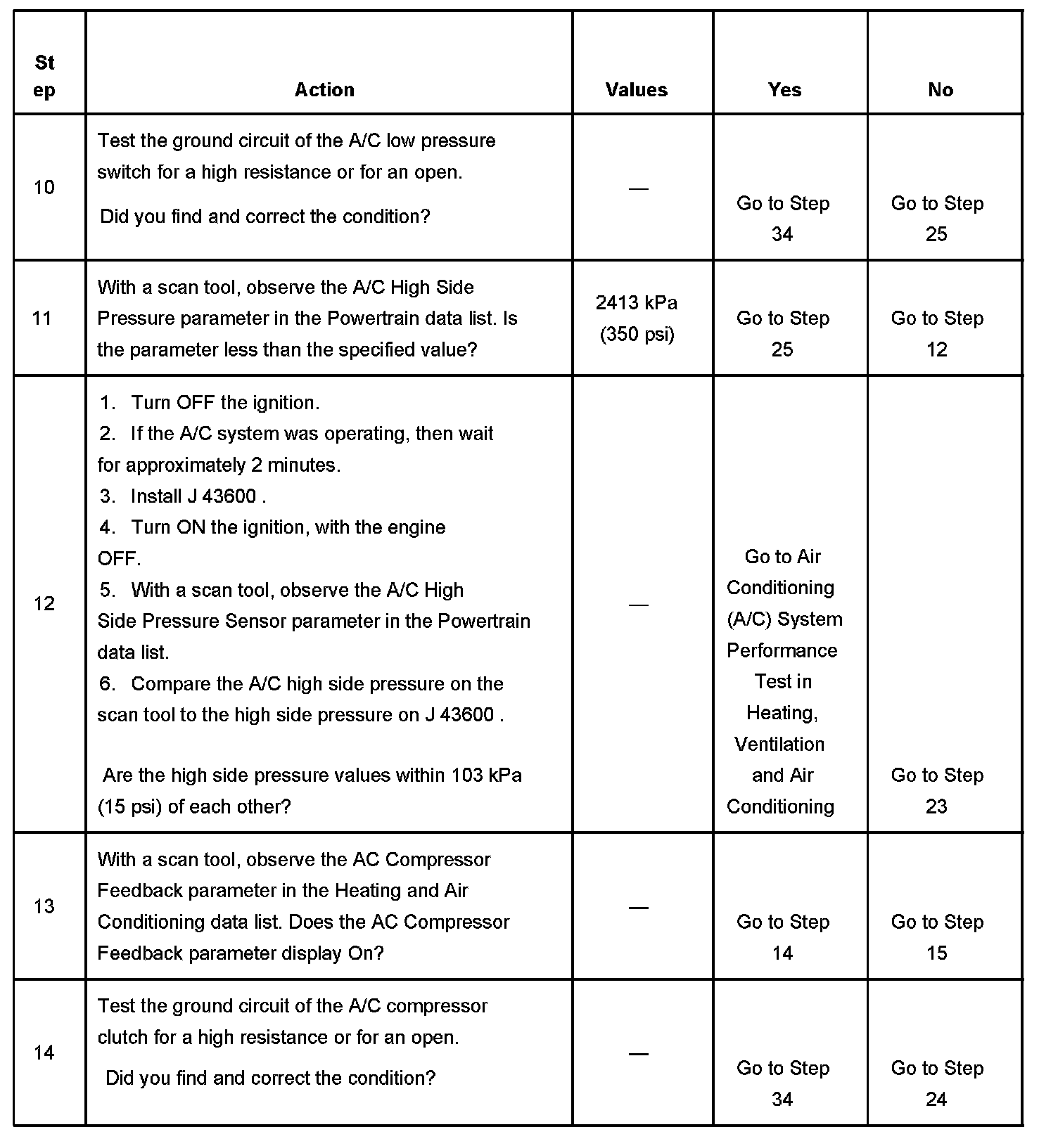 11. The A/C compressor relay output from the powertrain control module (PCM) is disabled if the A/C high side system pressure is interpreted to be higher than 2413 kPa (350 psi).