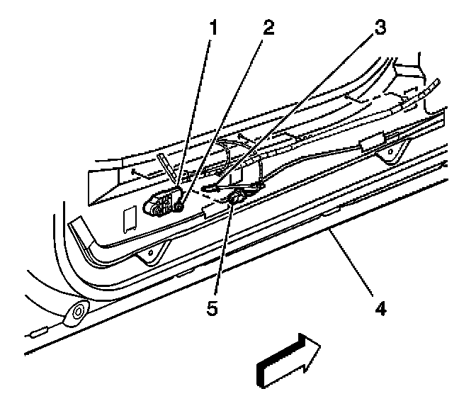 6. Remove the connector position assurance (CPA) (3) from the side impact sensor yellow 2-way connector (5) located near the bottom left of the door.