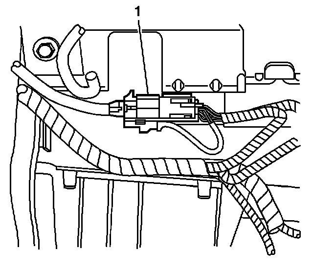 1. Remove the key from the ignition.2. Connect the steering wheel module yellow 4-way connector (2) located left of the steering column near the knee bolster.
