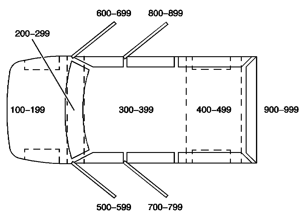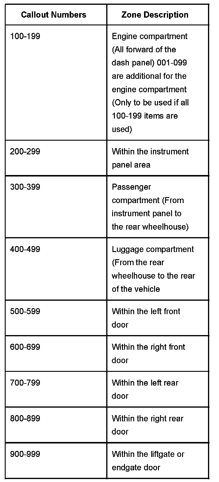 All grounds, in-line connectors, pass-through grommets, and splices have identifying numbers that correspond to where they are located in the vehicle. The table explains the numbering system.