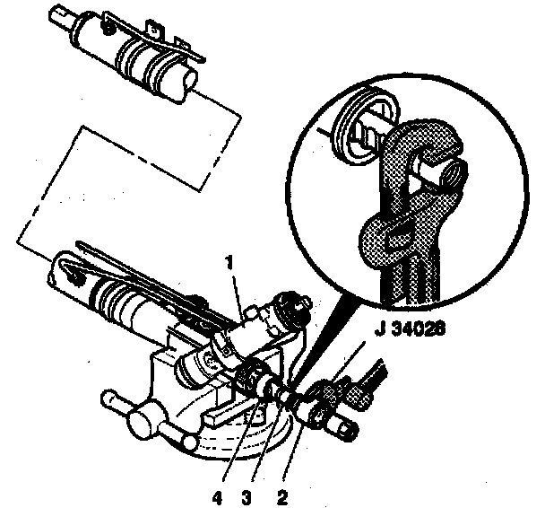 11. Place a torque wrench and J34028 on the flats of the inner tie rod housing (1).