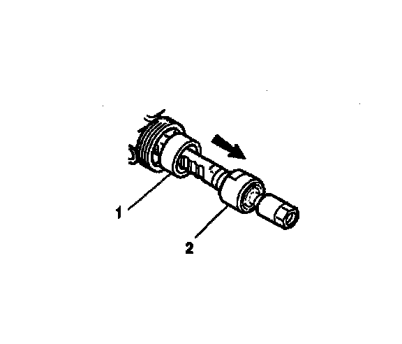 6. Slide the shock dampener (1) over the inner tie rod housing (2) until the front lip of the shock dampener (1) bottoms against the inner tie rod housing (2).