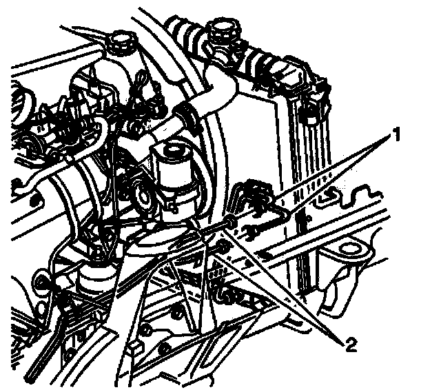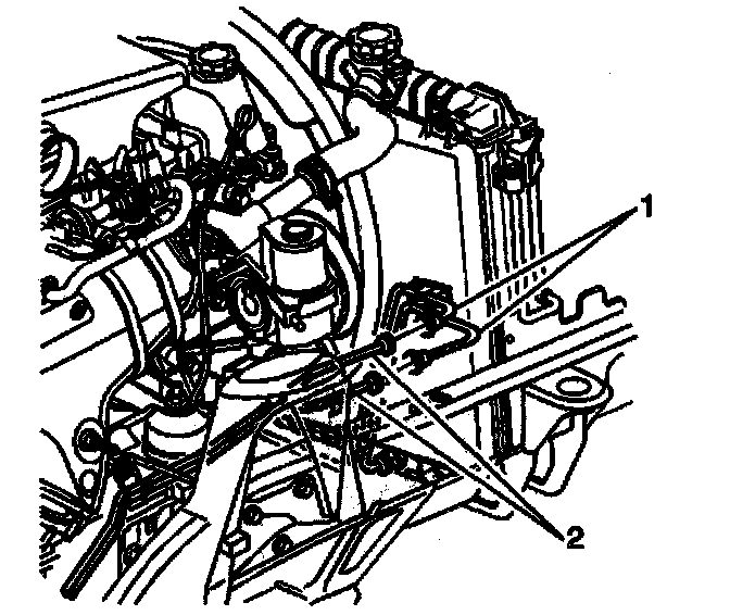 6. Remove the cooler lines from the retainer (1) located on the radiator shroud.