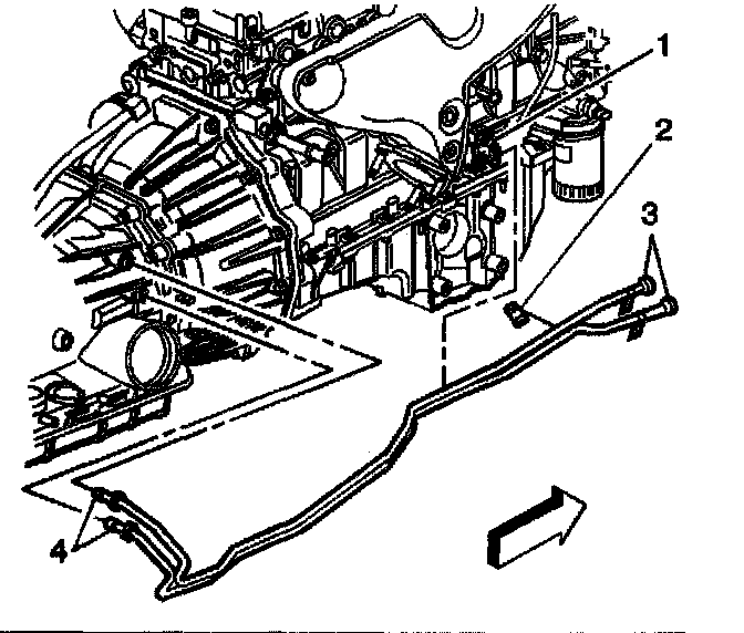 8. Remove the rear sections of the cooler lines from the retainer (1) located on the right side of the engine.