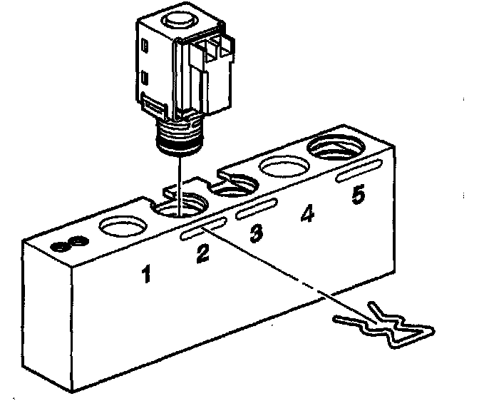 2. Install the TCC solenoid valve, the 1-2 Shift solenoid valve or the 2-3 Shift solenoid valve into bore number 2 of the J 44246 and install the factory retainer clip to retain the solenoid.
