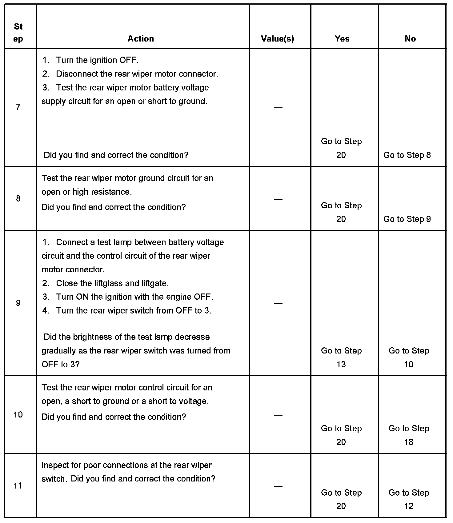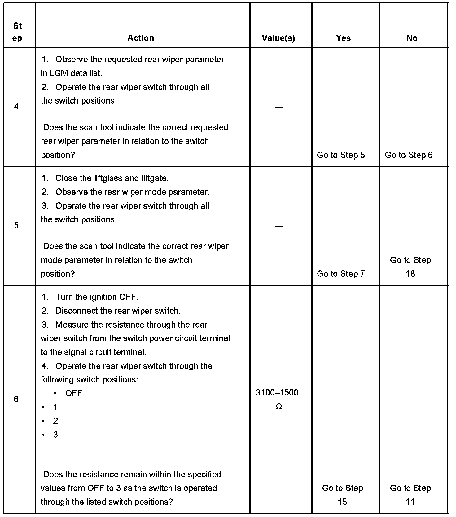 6. This step tests the resistance through the rear wiper switch. The measured resistance will be highest in the OFF position and reduce as the switch is turned from positions 1 through 3.
