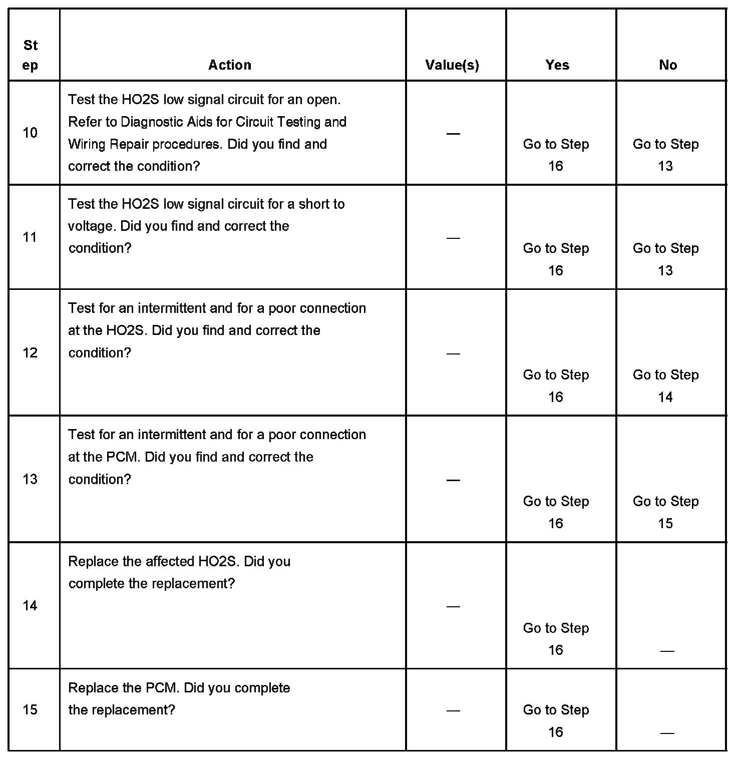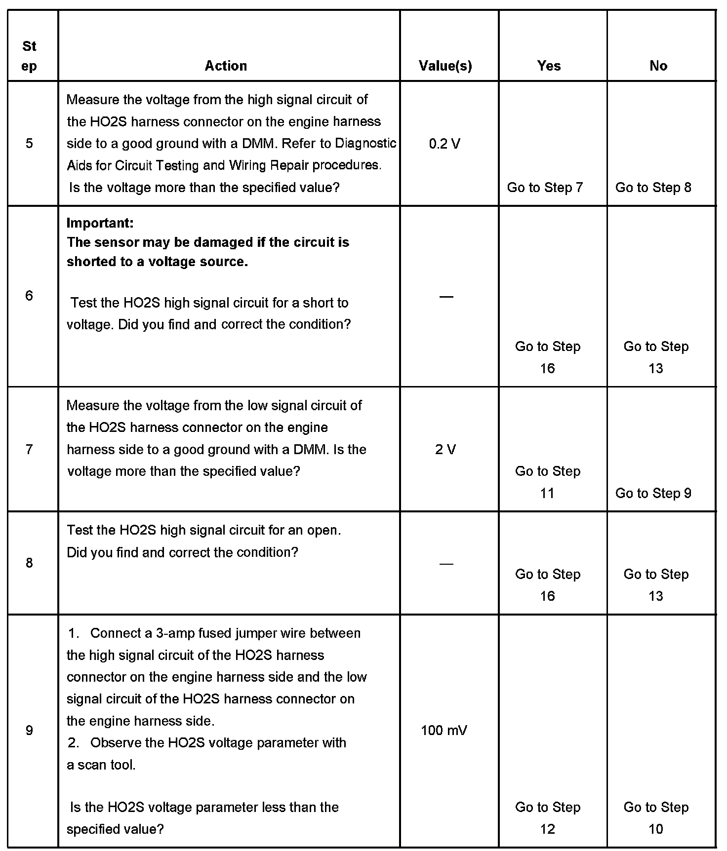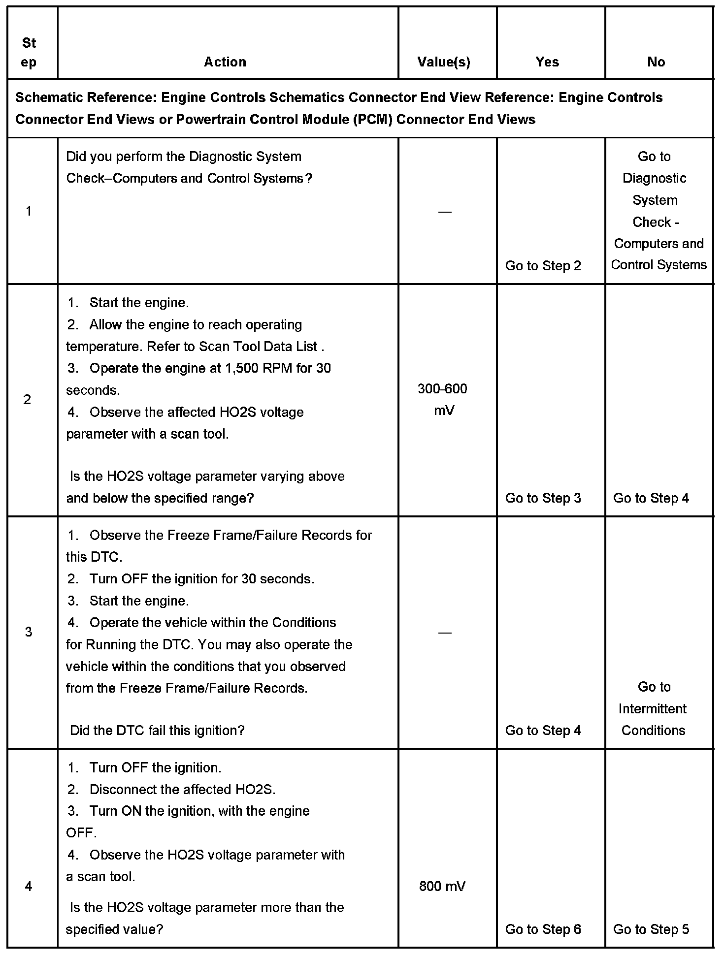 CIRCUIT DESCRIPTIONHeated oxygen sensors (HO2S) are used for fuel control and post catalyst monitoring. Each HO2S compares the oxygen content of the surrounding air with the oxygen content in the exhaust stream. The HO2S must reach operating temperature to provide an accurate voltage signal. Heating elements inside the HO2S minimize the time required for the sensors to reach operating temperature. The powertrain control module (PCM) supplies the HO2S with a reference, or bias, voltage of about 450 mV. When the engine is first started the PCM operates in open loop, ignoring the HO2S voltage signal. Once the HO2S reaches operating temperature and closed loop is achieved, the HO2S generates a voltage within a range of 0-1,000 mV that fluctuates above and below bias voltage. High HO2S voltage indicates a rich exhaust stream; low HO2S voltage indicates a lean exhaust stream. If the PCM detects that the HO2S voltage remains within the bias voltage range, DTCs P0134 or P0154 will set.