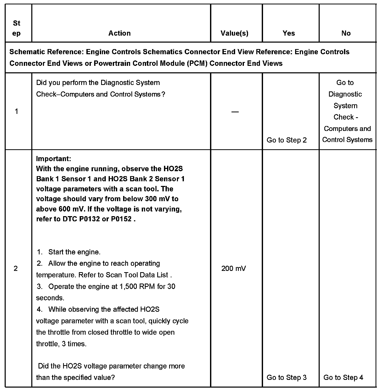 CIRCUIT DESCRIPTIONHeated oxygen sensors (HO2S) are used for fuel control and post catalyst monitoring. Each HO2S compares the oxygen content of the surrounding air with the oxygen content in the exhaust stream. The HO2S must reach operating temperature to provide an accurate voltage signal. Heating elements inside the HO2S minimize the time required for the sensors to reach operating temperature. The powertrain control module (PCM) supplies the HO2S with a reference, or bias, voltage of about 450 mV. When the engine is first started the PCM operates in open loop, ignoring the HO2S voltage signal. Once the HO2S reaches operating temperature and closed loop is achieved, the HO2S generates a voltage within a range of 0-1,000 mV that fluctuates above and below bias voltage. High HO2S voltage indicates a rich exhaust stream; low HO2S voltage indicates a lean exhaust stream. If the PCM detects an HO2S voltage that stays below a specified value, DTCs P0137 or P0157 will set.
