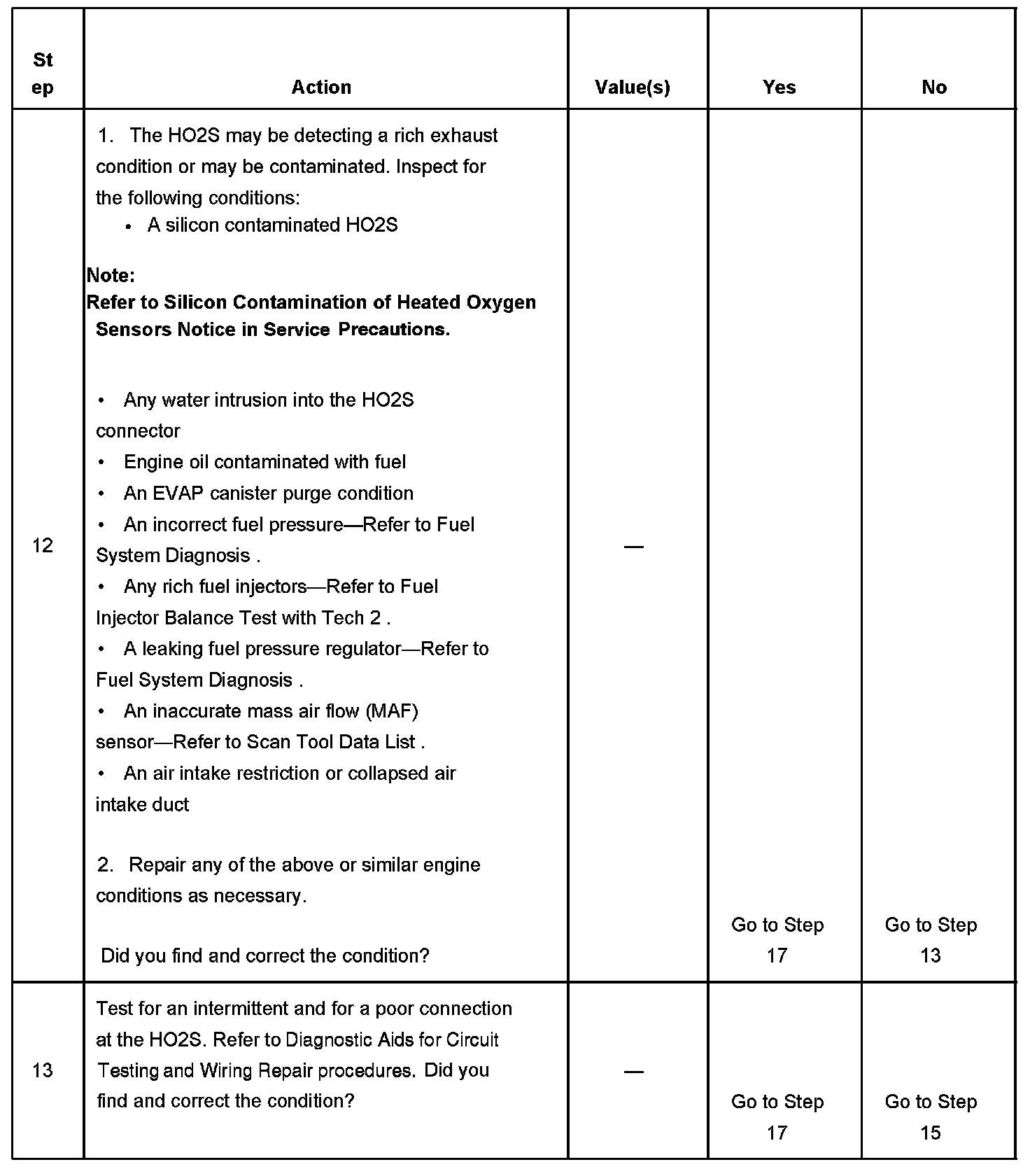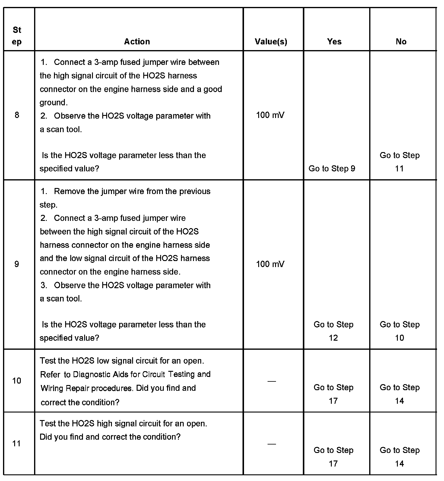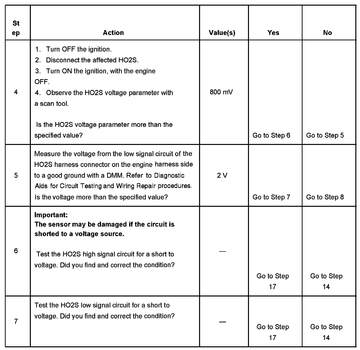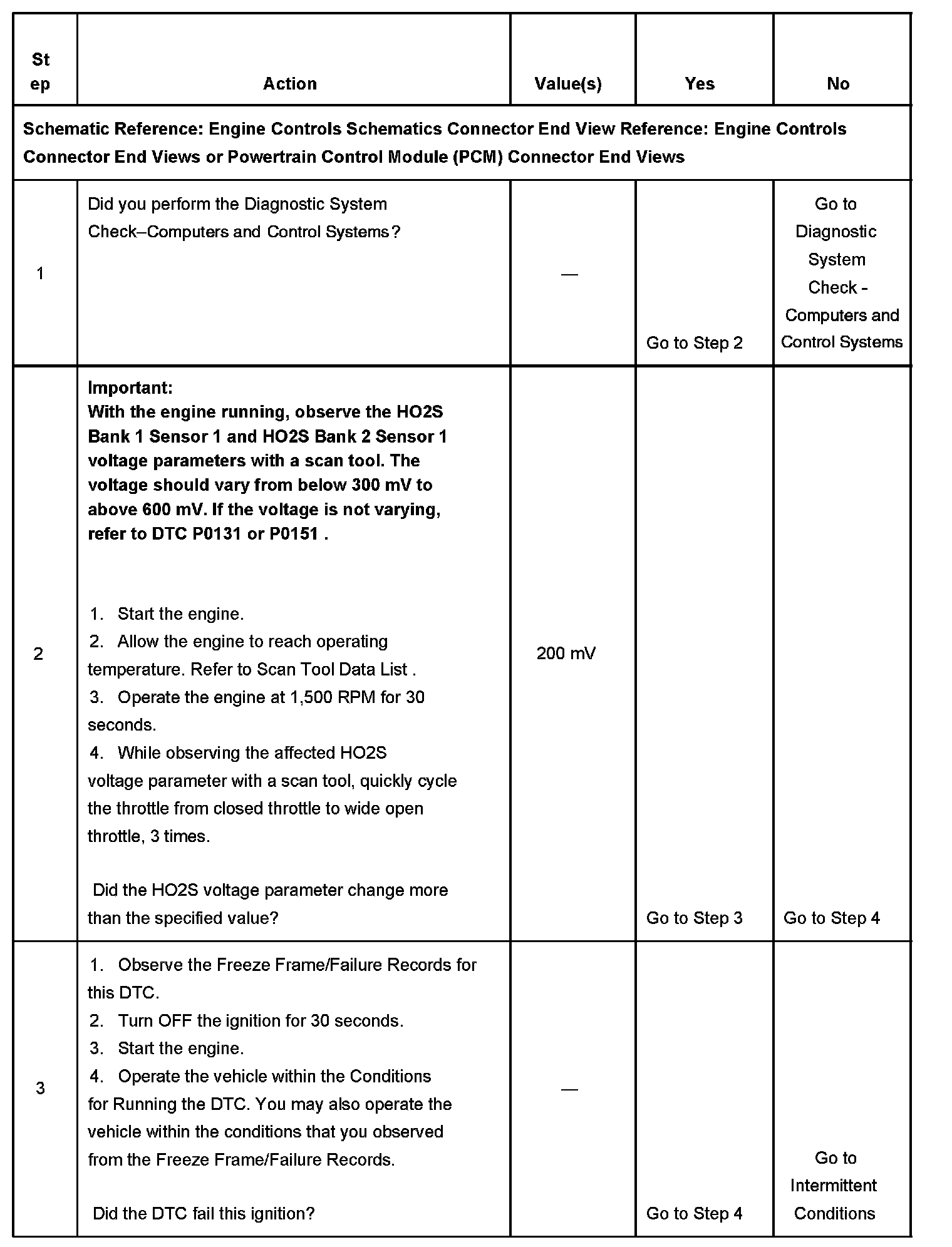 CIRCUIT DESCRIPTIONHeated oxygen sensors (HO2S) are used for fuel control and post catalyst monitoring. Each HO2S compares the oxygen content of the surrounding air with the oxygen content in the exhaust stream. The HO2S must reach operating temperature to provide an accurate voltage signal. Heating elements inside the HO2S minimize the time required for the sensors to reach operating temperature. The powertrain control module (PCM) supplies the HO2S with a reference, or bias, voltage of about 450 mV. When the engine is first started the PCM operates in open loop, ignoring the HO2S voltage signal. Once the HO2S reaches operating temperature and closed loop is achieved, the HO2S generates a voltage within a range of 0-1,000 mV that fluctuates above and below bias voltage. High HO2S voltage indicates a rich exhaust stream; low HO2S voltage indicates a lean exhaust stream. If the PCM detects an HO2S voltage that stays above a specified value, DTCs P0138 or P0158 will set.