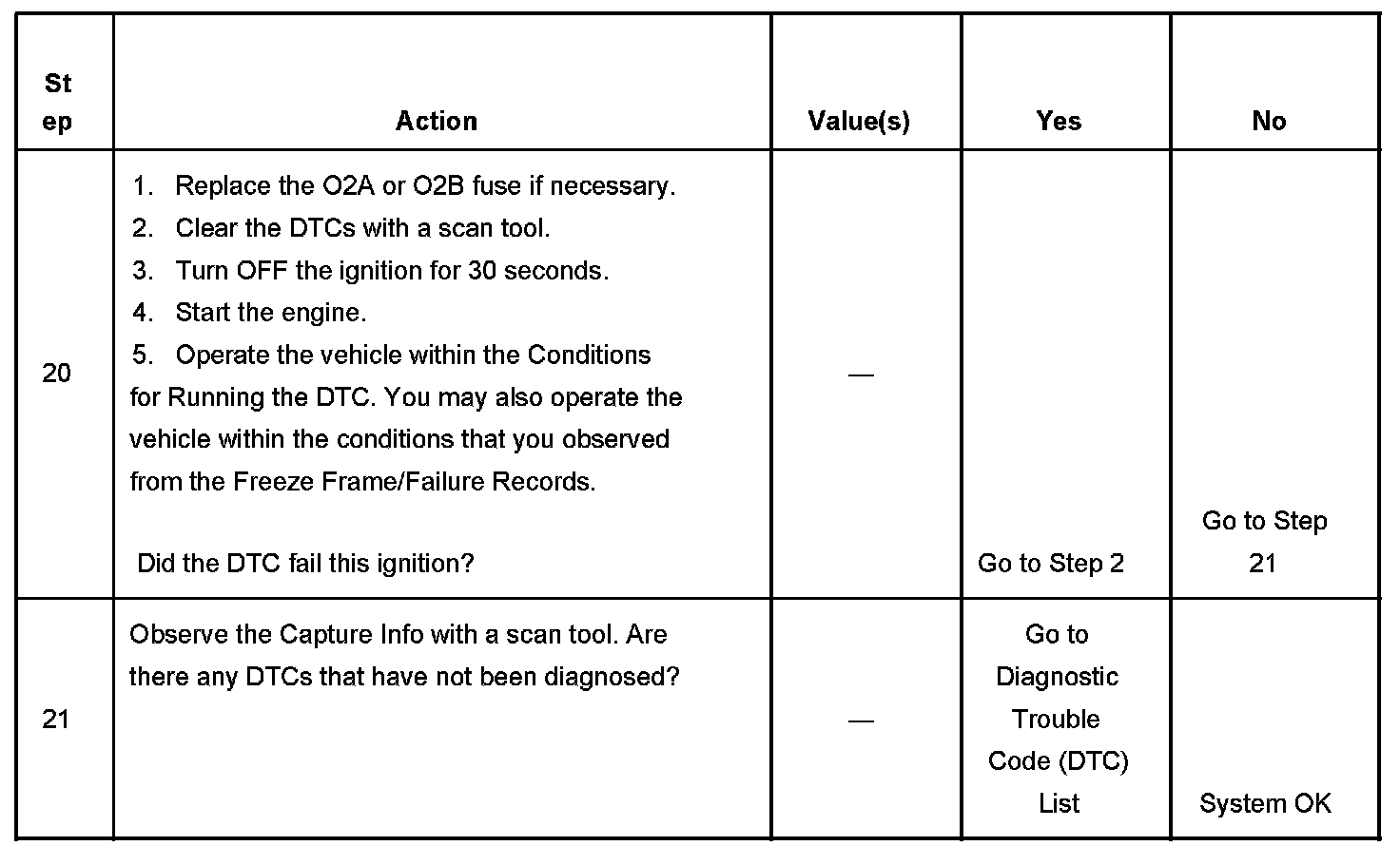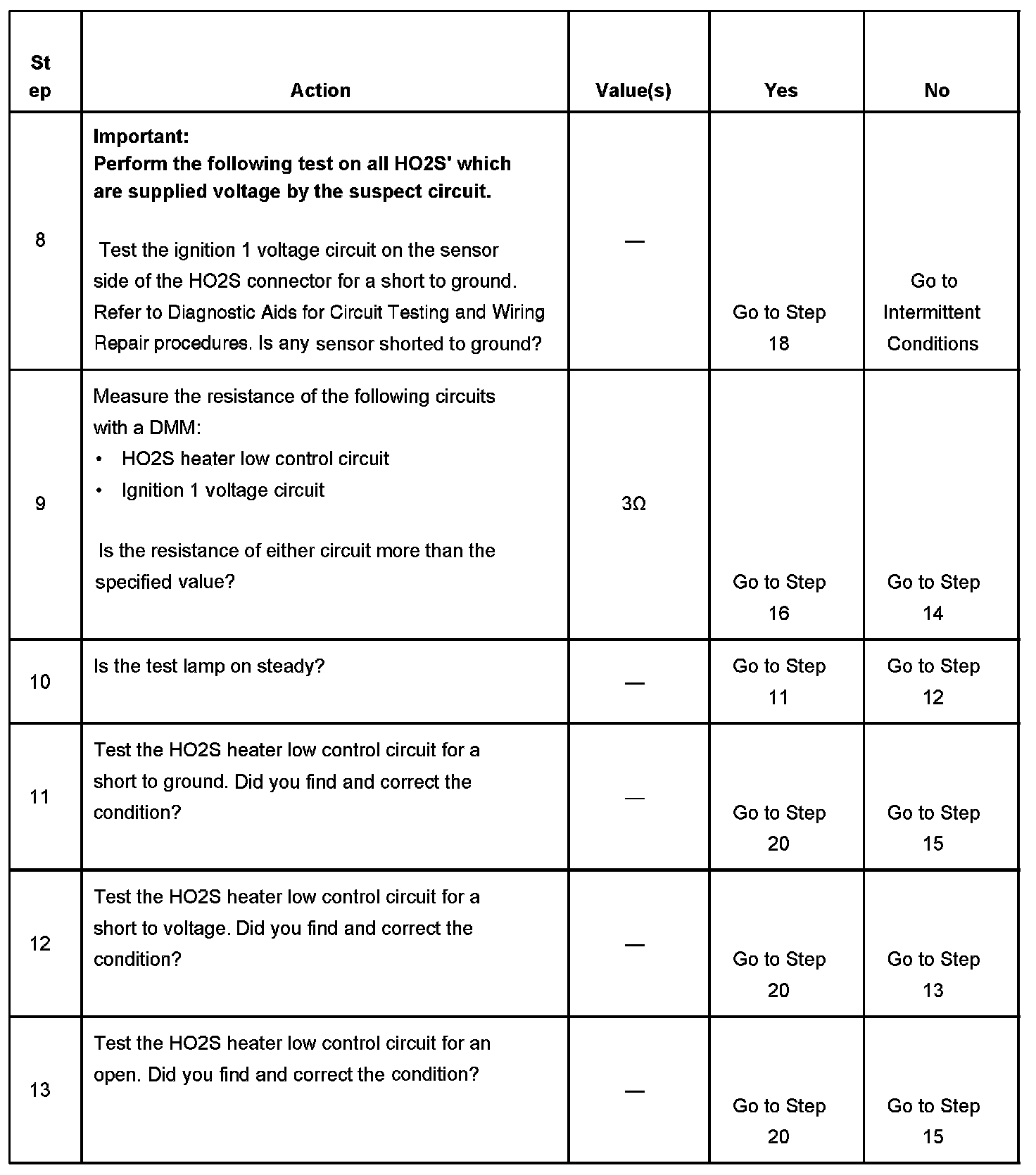 CIRCUIT DESCRIPTIONThe heated oxygen sensor (HO2S) must reach operating temperature to provide an accurate voltage signal. A heating element inside the HO2S minimizes the time required for the sensor to reach operating temperature. Voltage is provided to the heater by the ignition 1 voltage circuit through a fuse. With the engine running, ground is provided to the heater by the HO2S heater low control circuit, through a low side driver within the powertrain control module (PCM). The PCM commands the heater ON or OFF to maintain a specific HO2S operating temperature range. The PCM determines the temperature by measuring the current flow through the heater. When the heater is in the ON state, the PCM will pulse the heater OFF for a duration of 50 ms, once per second. When the heater is in the OFF state, the PCM will pulse the heater ON for a duration of 50 ms, once per second. The PCM also monitors the current flow through the heater for diagnosis. This diagnostic will only run once per ignition cycle. If the PCM detects that the current is above or below a specified range, DTCs P0135, P0141, P0155, or P0161 sets.