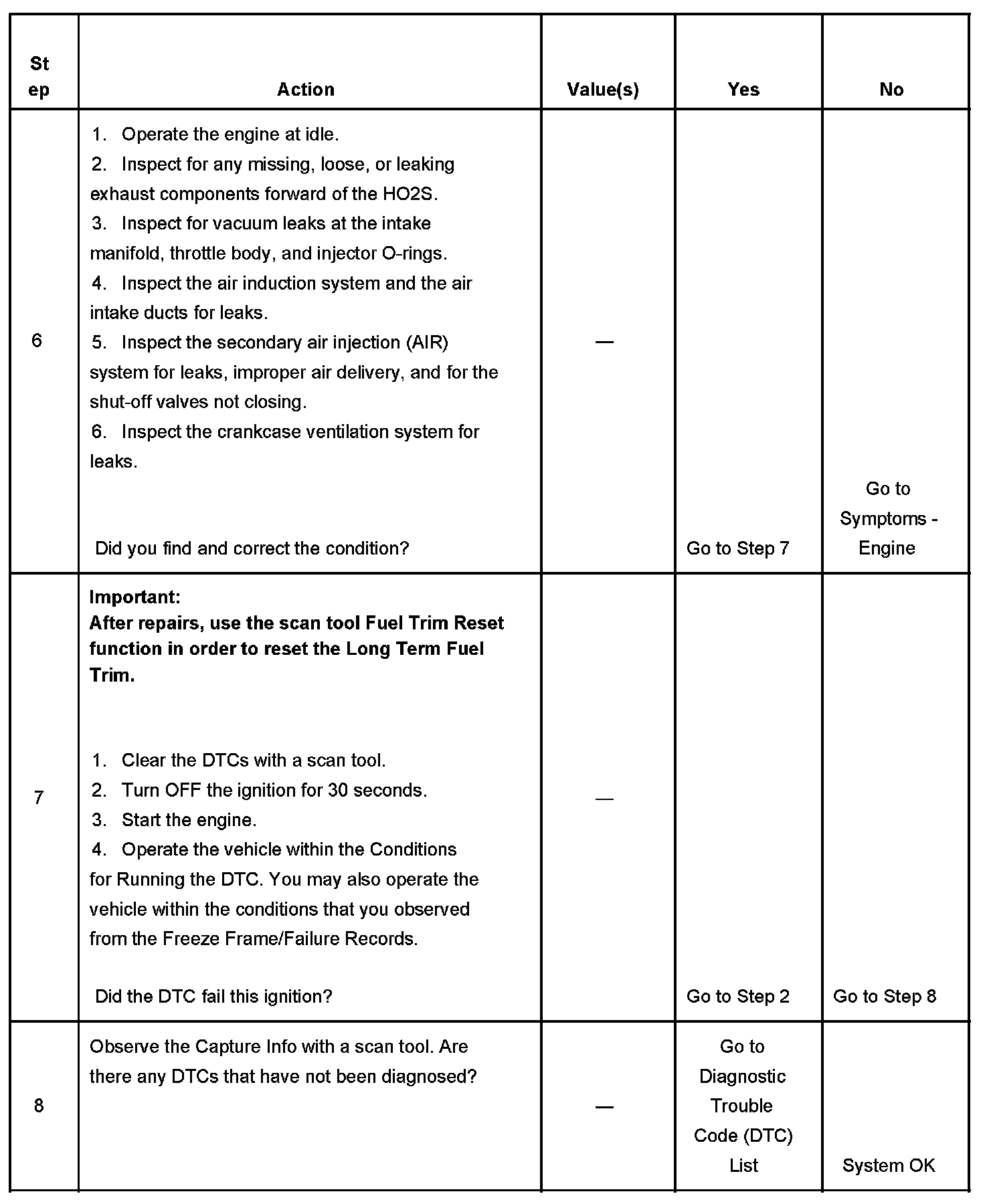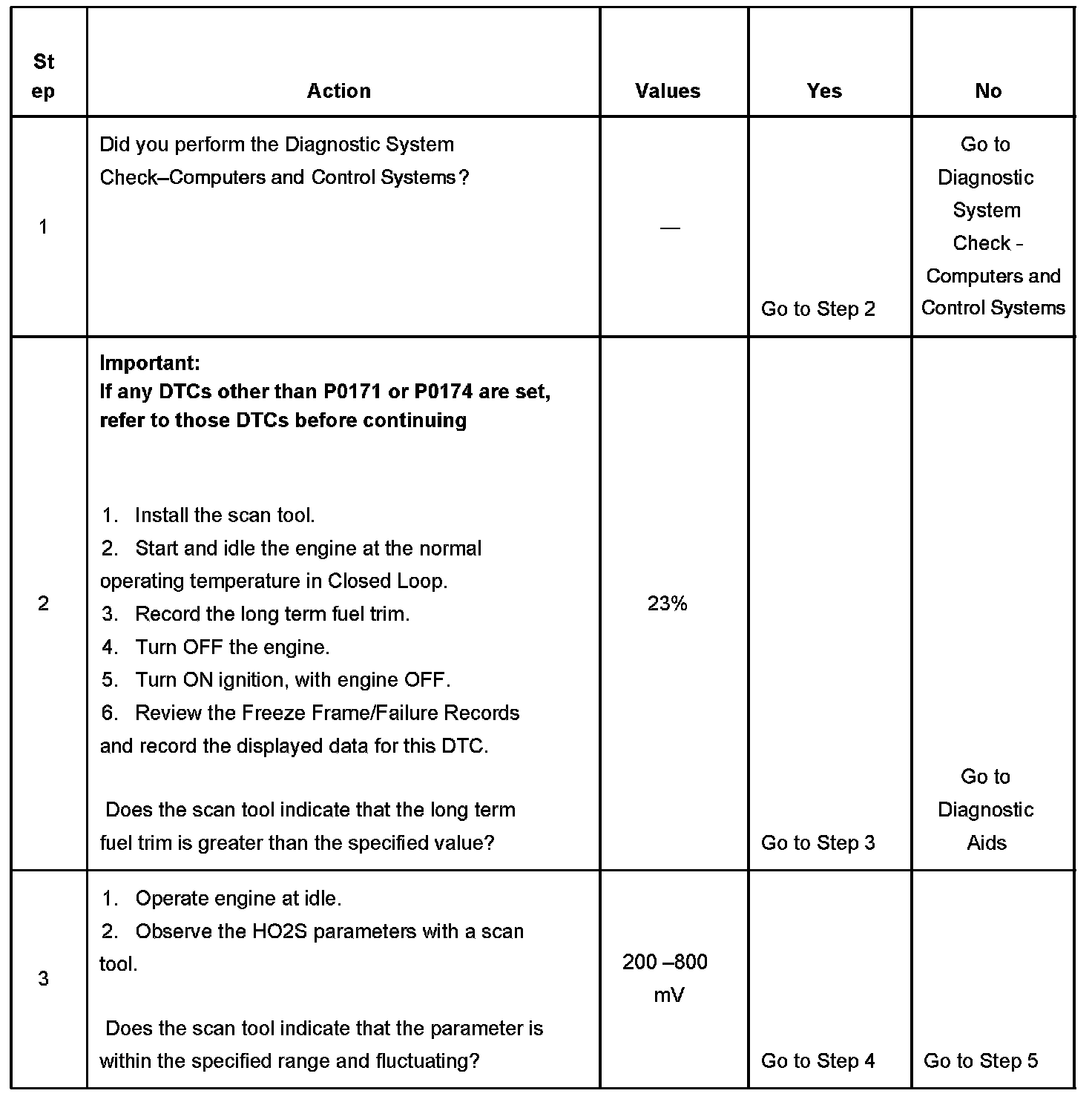 CIRCUIT DESCRIPTIONThe powertrain control module (PCM) controls the air/fuel metering system in order to provide the best possible combination of driveability, fuel economy, and emission control. Fuel delivery is controlled differently during Open and Closed Loop. During Open Loop, the PCM determines fuel delivery based on sensor signals without oxygen sensor (O2S) input. During Closed Loop, the O2S inputs are added and used by the PCM to calculate short and long term fuel trim fuel delivery adjustments. If the O2S indicate a lean condition, fuel trim values will be above 0 percent. If the O2S indicate a rich condition, fuel trim values will be below 0 percent. Short term fuel trim values change rapidly in response to the heated oxygen sensor (HO2S) voltage signals. Long term fuel trim makes coarse adjustments in order to maintain an air/fuel ratio of 14.7:1. If the PCM detects an excessively lean condition, DTC P0171 or P0174 sets.