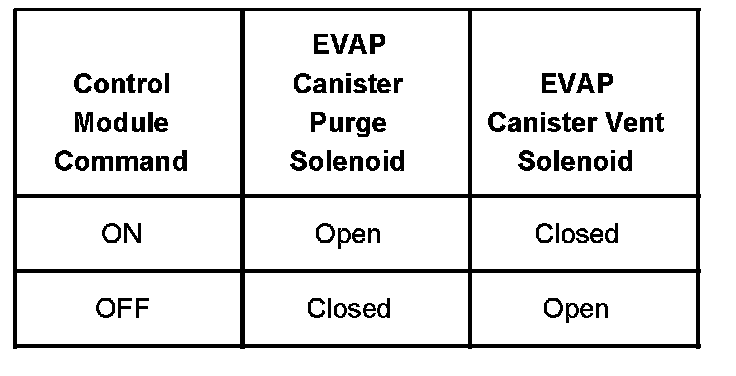 The table illustrates the relationship between the ON and OFF states, and the Open or Closed states of the EVAP canister purge and vent valves.