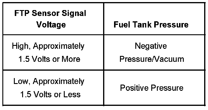 The table illustrates the relationship between the FTP sensor signal voltage and the EVAP system pressure/vacuum.