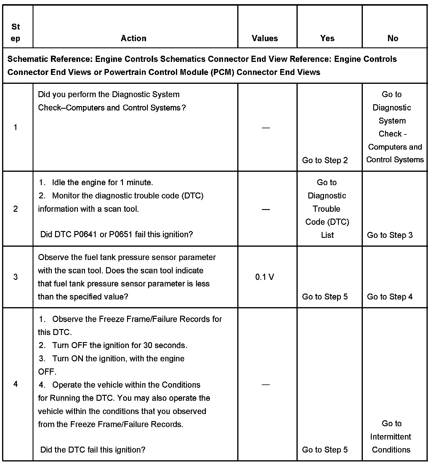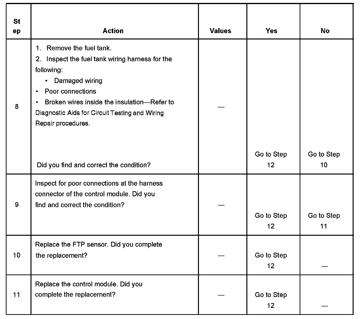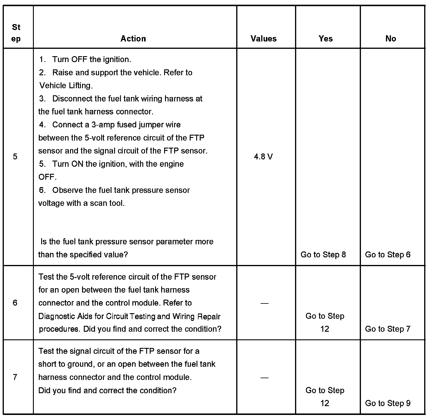CIRCUIT DESCRIPTIONThe fuel tank pressure (FTP) sensor measures the difference between the air pressure or vacuum in the evaporative emission (EVAP) system, and the outside air pressure. The control module supplies a 5-volt reference and a low reference circuit to the FTP sensor. The FTP sensor signal circuit voltage varies depending on EVAP system pressure or vacuum. If the FTP sensor signal voltage goes below a calibrated value, this DTC sets.