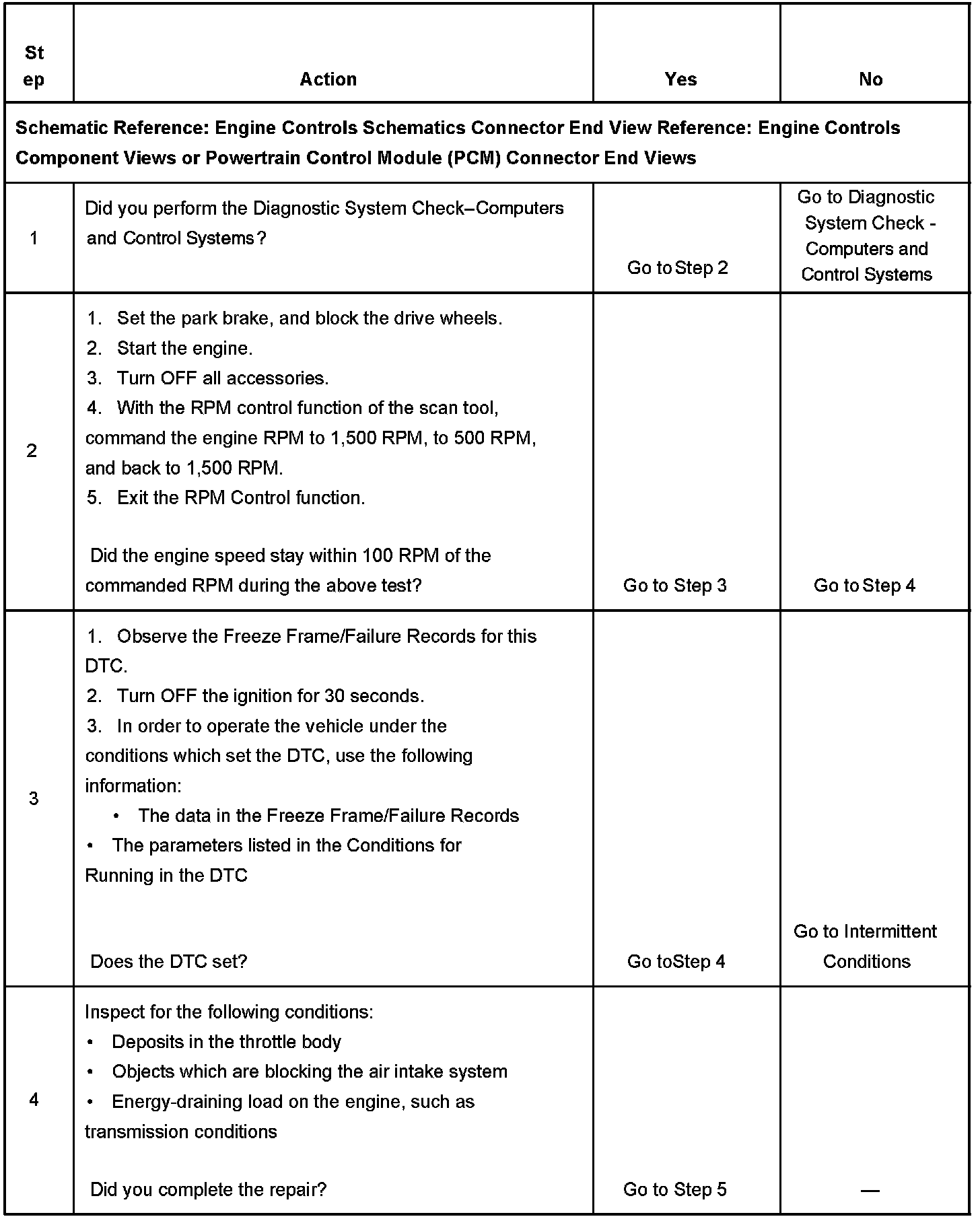 The electronic throttle control (ETC) system uses various inputs from the powertrain control module (PCM). This system uses the inputs in order to control the idle speed through serial data circuits to the throttle actuator control (TAC) module. The DC motor, which is located on the throttle body, activates the throttle plate. In order to decrease idle speed, the TAC module commands the throttle closed reducing air flow into the engine and the idle speed decreases. In order to increase the idle speed, the TAC module commands the throttle plate open allowing more air in order to bypass the throttle plate. If the actual idle RPM does not match the desired idle RPM within a calibrated time, this DTC will set.
