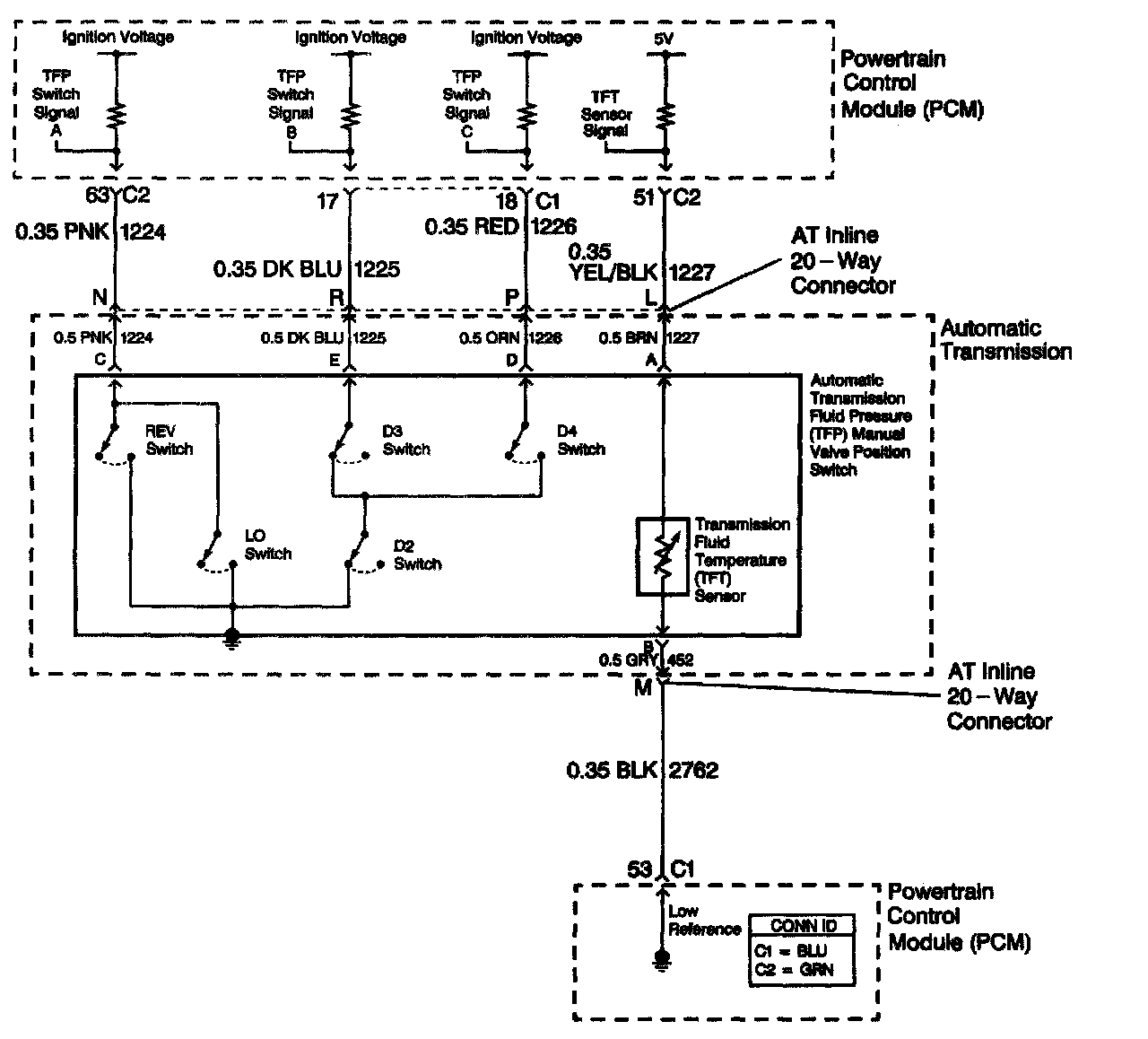 The automatic transmission fluid temperature (TFT) sensor is part of the automatic transmission fluid pressure (TFP) manual valve position switch. The TFT sensor is a resistor, or thermistor, which changes value based on temperature. The sensor has a negative-temperature coefficient. This means that as the temperature increases, the resistance decreases, and as the temperature decreases, the resistance increases. The powertrain control module (PCM) supplies a 5-volt reference signal to the sensor on the TFT sensor signal circuit and measures the voltage drop in the circuit. When the transmission fluid is cold, the sensor resistance is high and the PCM detects high signal voltage. As the fluid temperature warms to a normal operating temperature, the resistance becomes less and the signal voltage decreases. The PCM uses this information to control Shift quality and torque converter clutch apply.