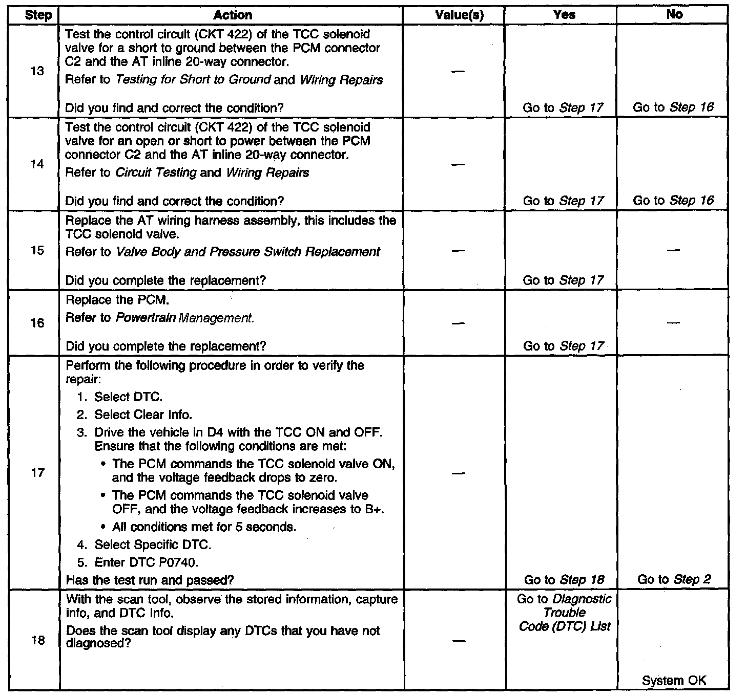 When the PCM detects a continuous open, short to ground or short to power in the TCC solenoid valve circuit, then DTC P0740 sets. DTC P0740 is a type B DTC.