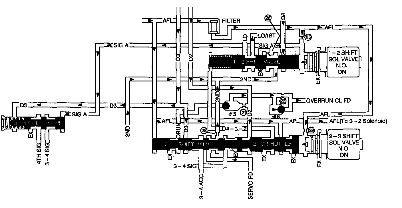 The 2-3 Shift solenoid (SS) valve controls the fluid flow acting on the 2-3 Shift valves. The 2-3 SS valve is a normally-open exhaust valve that is used with the 1-2 SS valve, in order to allow four different shifting combinations.