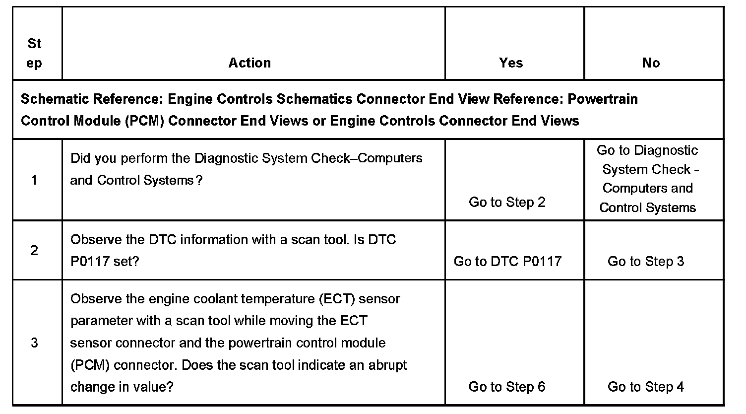 CIRCUIT DESCRIPTIONThe engine coolant temperature (ECT) sensor is a variable resistor, that measures the temperature of the engine coolant. The powertrain control module (PCM) supplies 5 volts to the ECT signal circuit and a ground for the ECT low reference circuit. When the ECT is cold, the sensor resistance is high. When the ECT increases, the sensor resistance lowers. With high sensor resistance, the PCM detects a high voltage on the ECT signal circuit. With lower sensor resistance, the PCM detects a lower voltage on the ECT signal circuit. If the PCM detects an excessively high signal voltage, which is a low temperature indication, DTC P1115 sets.