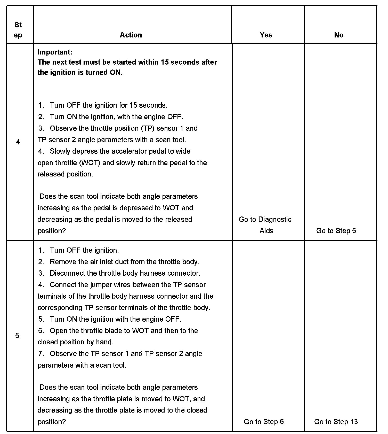 5. If the TP indicated angle does not follow the movement of the throttle blade, and no TP sensor DTCs are set, there is a mechanical condition with the throttle shaft or the TP sensor.